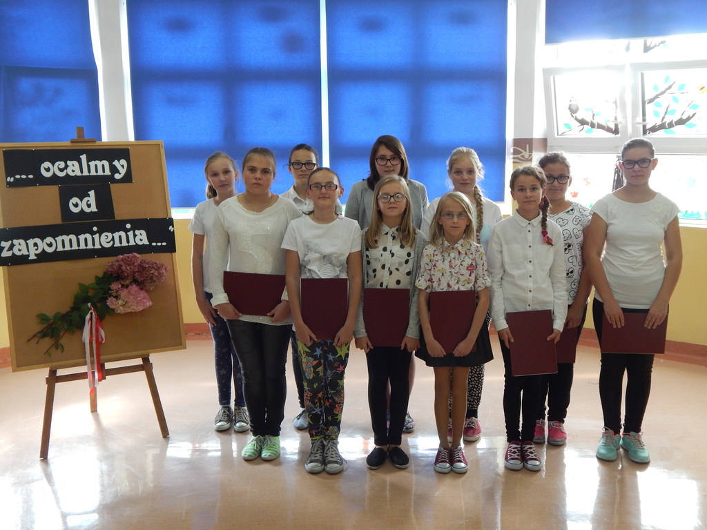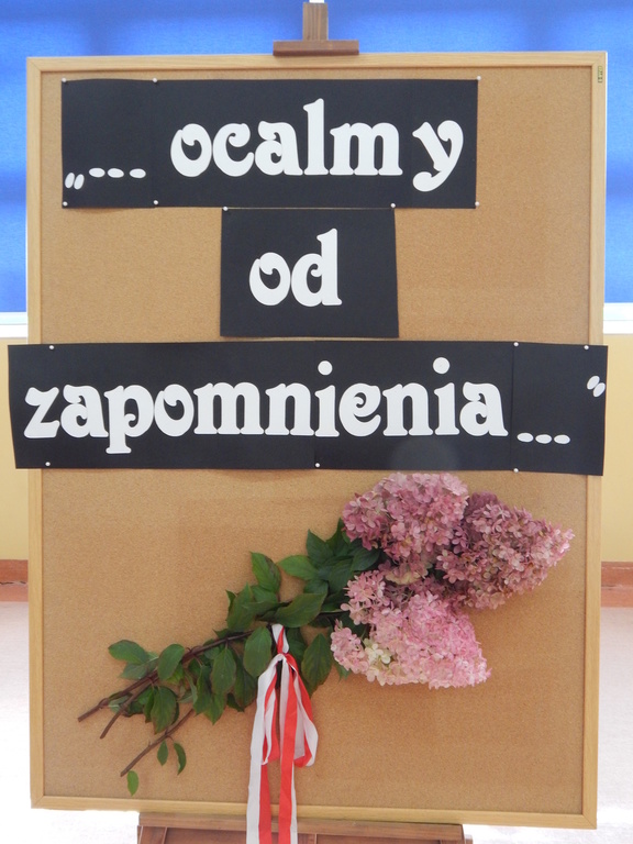 Jak co roku szkolni artyści pod opieką p. M. Skalskiej przygotowali krótki apel upamiętniający bohaterów II wojny światowej. Chcąc "...ocalić od zapomnienia..." przypomnieli tragiczne chwile historii naszego kraju. Całość inscenizacji została uświetniona przez występ szkolnego zespołu wokalnego pod batutą p. A. Lis.