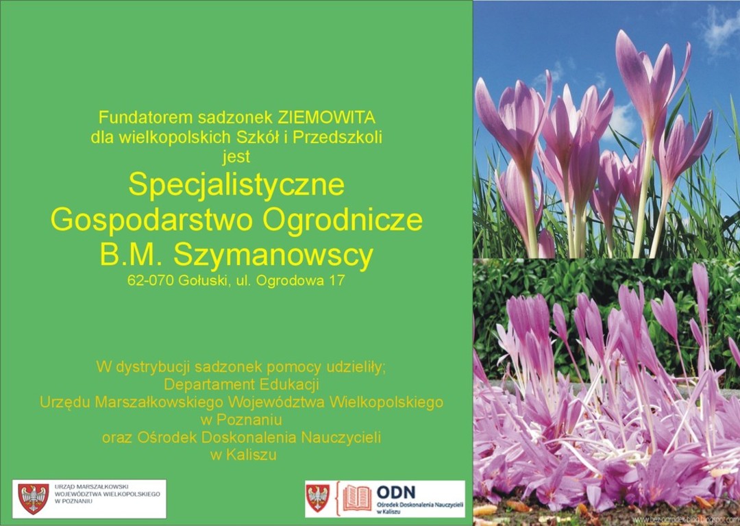 Dzięki pośrednictwu Ośrodka Doskonalenia Nauczycieli w Kaliszu nasza szkoła otrzymała cebulki ziemowitów, które jesienią ozdobią otoczenie budynku. Kwiaty wyglądem przypominają krokusy, ale w przeciwieństwie do nich, kwitną jesienią.