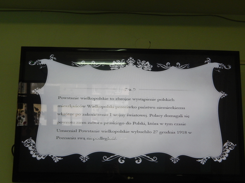 Uczniowie klas V-VII w marcu wykonali prezentacje multimedialne na temat Powstania Wielkopolskiego z 1918r. Społeczność uczniowska podczas długich przerw, w dniach 22.03-28.03 uczestniczyła w prelekcjach przygotowanych przez uczestników konkursu Tytus. Po raz kolejny promowaliśmy wiedzę historyczną, popularyzując historię regionu wielkopolskiego, w szczególności kaliskiego. Akcja cieszyła się dużym zainteresowaniem.
