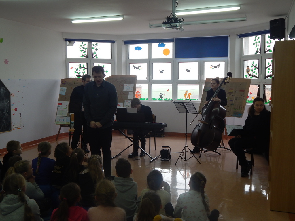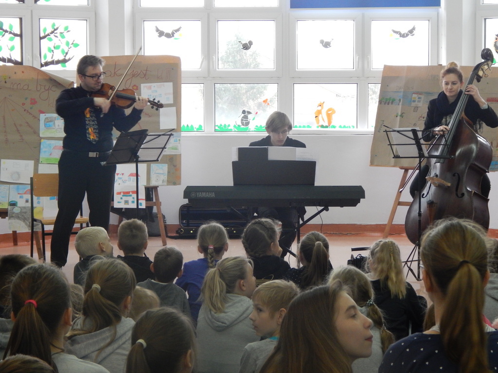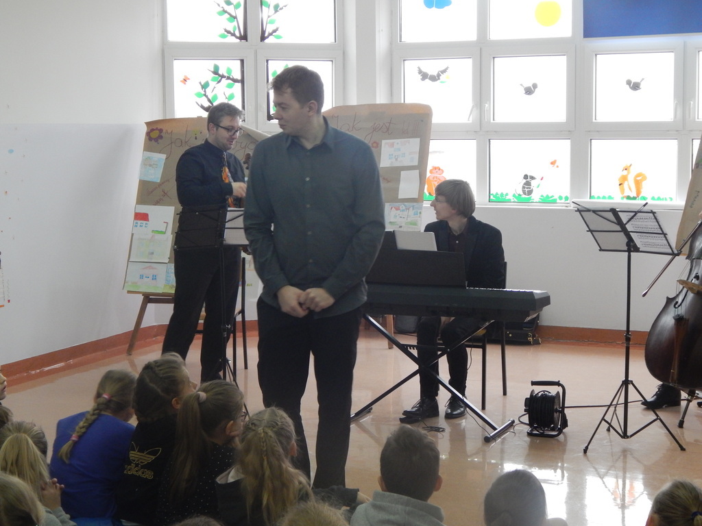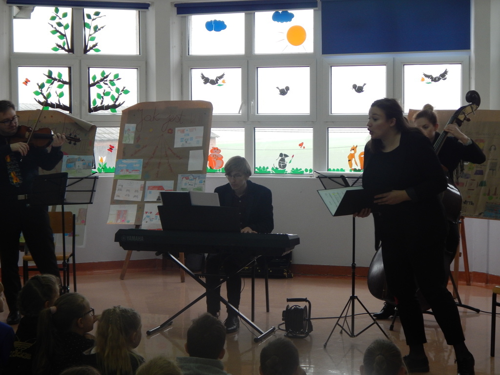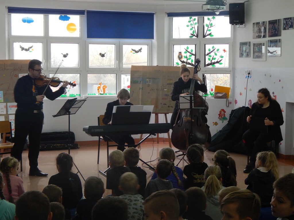 Tradycją naszej szkoły stały się już cykliczne spotkania z muzykami Filharmonii Kaliskiej. Ostatnie z nich miało miejsce 15 listopada. Z ogromną radością zasiedliśmy na szkolnym korytarzu gotowi na kolejną żywą lekcję muzyki. Było wspaniale i śpiewająco! Wysłuchaliśmy między innymi utworów Stanisława Moniuszki: "Prząśniczki", pieśni "Chochlik" oraz ""Arii Skołuby" z opery "Straszny Dwór". Ponadto nasi uczniowie wykazali się dużą wiedzą o Fryderyku Chopinie. Jesteśmy z nich bardzo dumni i zarazem przekonani, że podobał im się koncert, bo wielu z nich jeszcze długo śpiewało pieśń o chochliku.