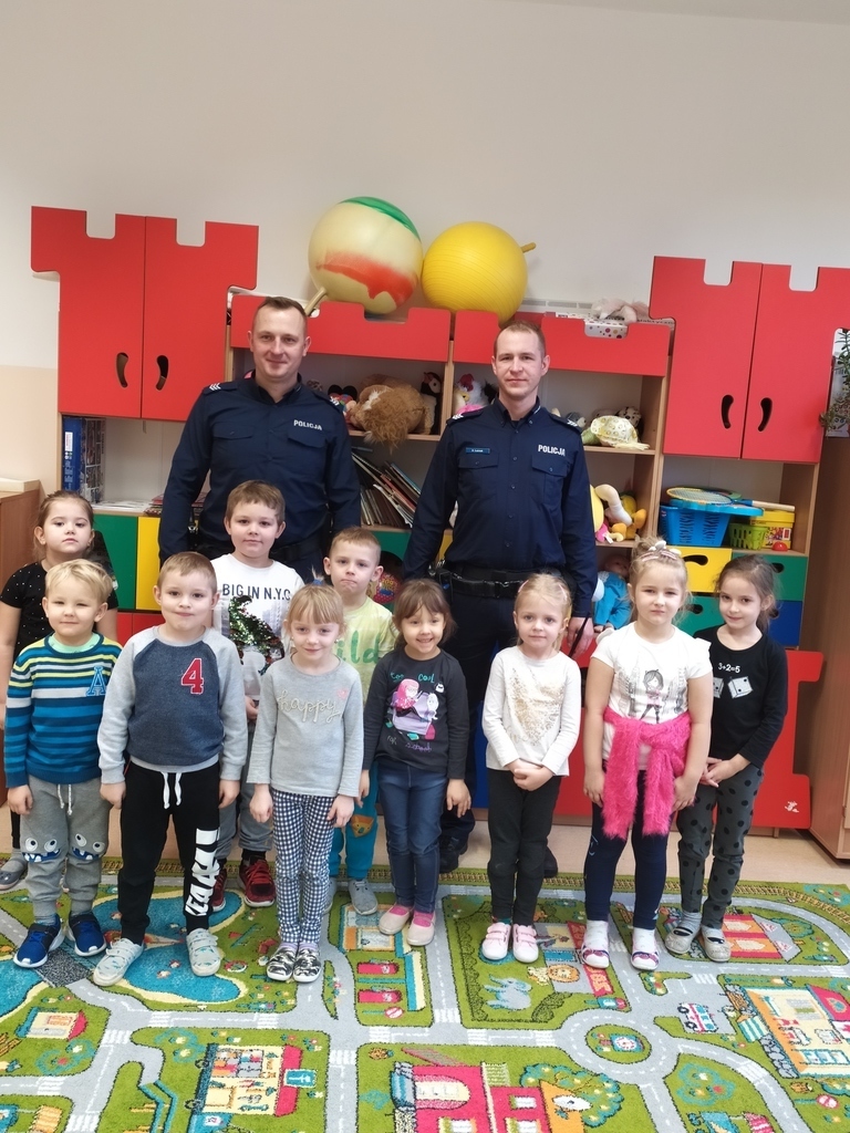 09.01.2020 roku dzieci w oddziale przedszkolnym odwiedzili policjanci. Opowiadali oni dzieciom o swojej pracy oraz przeprowadzili pogadankę na temat bezpiecznych ferii, wybierania odpowiednich miejsc do zabawy, jak należy zachować się w niebezpiecznych sytuacjach. Utrwalili z dziećmi zasady bezpiecznego poruszania się po drodze i nr telefonów alarmowych.