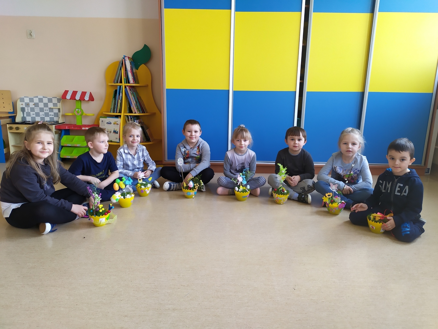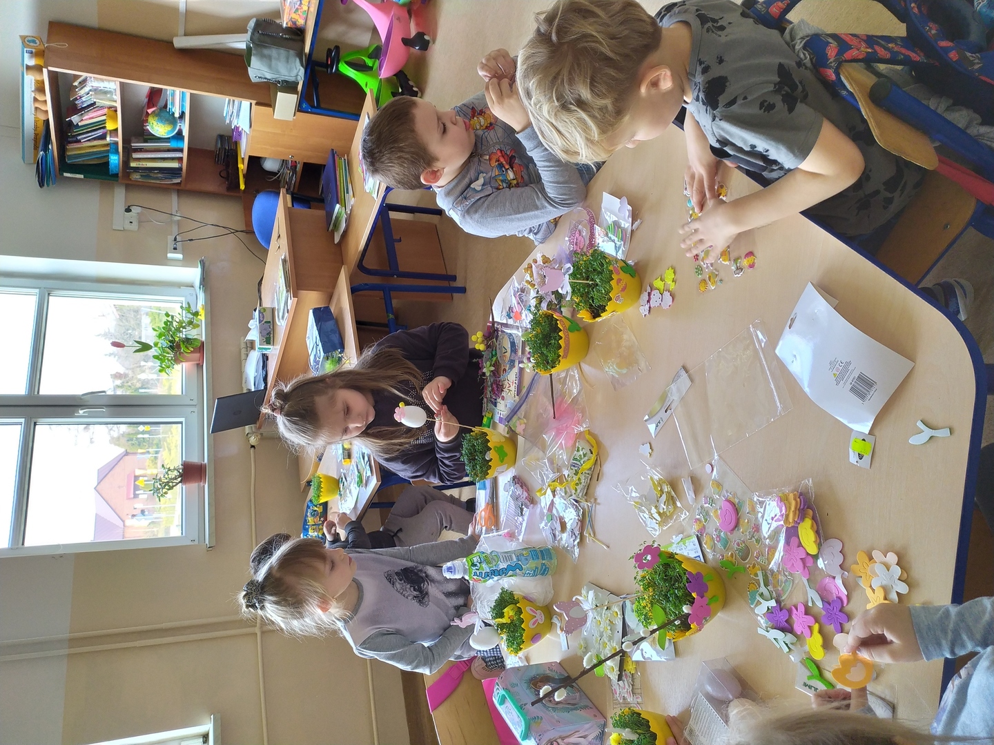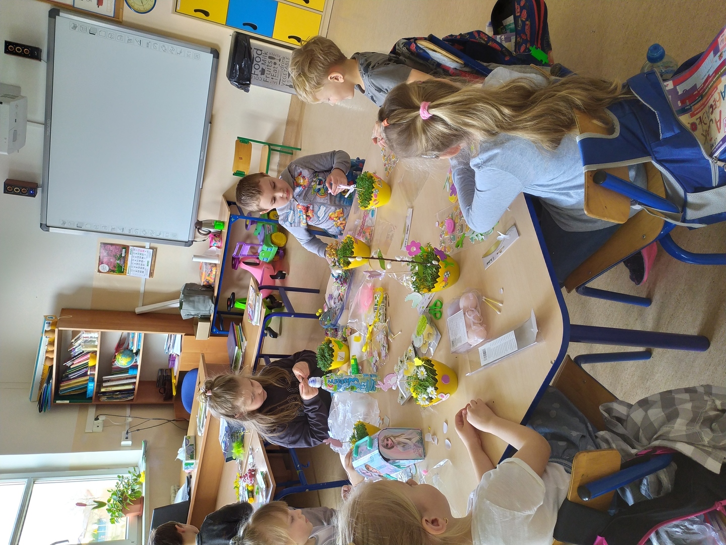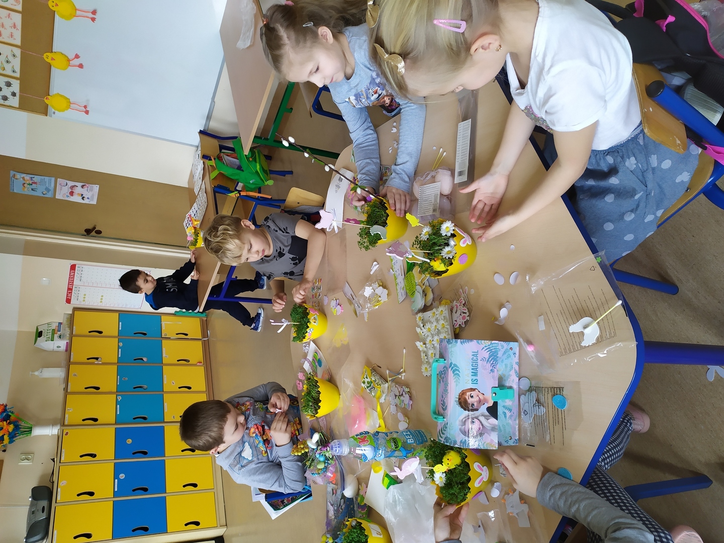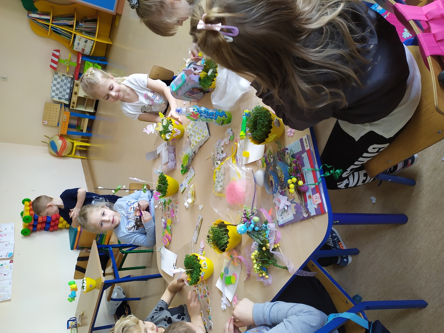 W oczekiwaniu na święta wielkanocne przedszkolaki w doniczki wysiewaly rzeżuchę, a w tygodniu poprzedzającym święta robiły z rzeżuchy stroiki świąteczne.