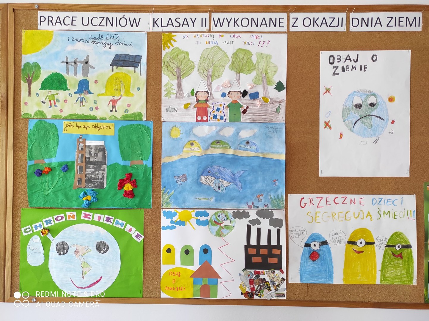 Podczas zdalnego nauczania uczniowie klasy drugiej wraz ze swoją wychowawczynią poruszali temat dotyczący ochrony środowiska i dbania o naszą planetę. Poświęcili na to sporo czasu. Zdobytą wiedzę i poznane ciekawostki wykorzystali na zajęciach edukacji technicznej podczas tworzenia plakatów o tematyce ekologicznej. Wszystko bardzo ładnie wpisało się w obchody Dnia Ziemi, który w tym roku przebiegał pod hasłem "Przywróć naszą Ziemię". Swoje prace dzieci przyniosły do szkoły, dzięki czemu powstała piękna wystawa. Jesteśmy przekonani, że z taką wiedzą i troską o naszą planetę możemy wiele dobrego zdziałać dla naszej Matki Ziemi.