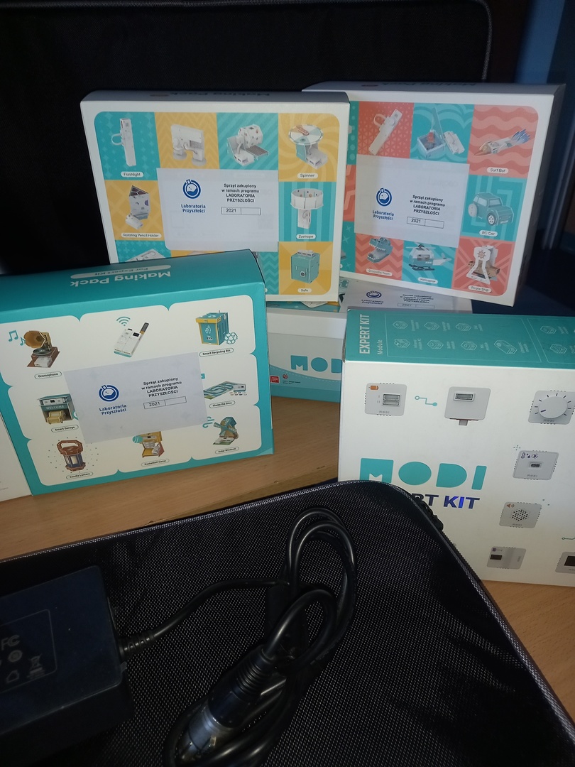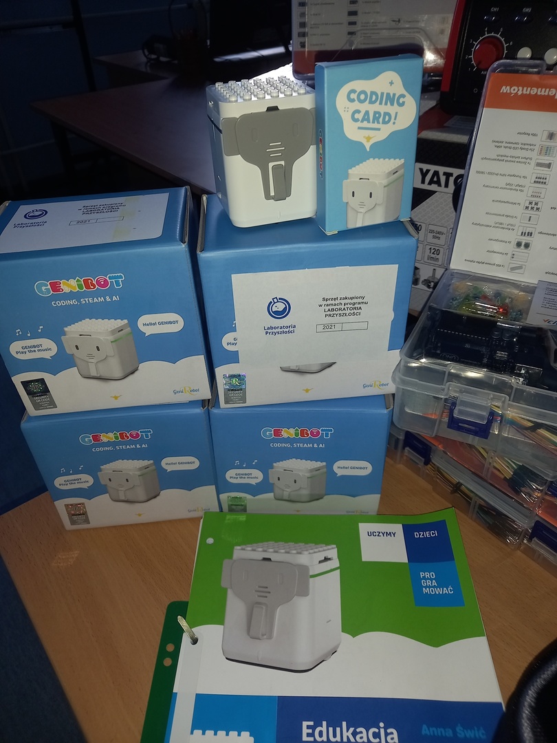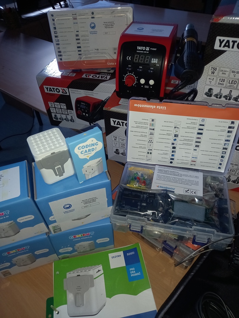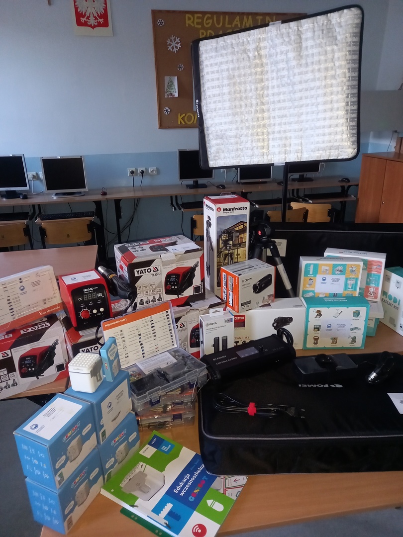 Zakupiono m.in. sprzęt do realizacji nagrań: kamerę przenośną, oświetlenie, statyw z akcesoriami, mikrofon kierunkowy i inne, zróżnicowane zestawy klocków konstrukcyjnych i GeniBotów, czyli robotów uatrakcyjniających naukę programowania a także stacje lutownicze i zestawy mikrokontrolerów.