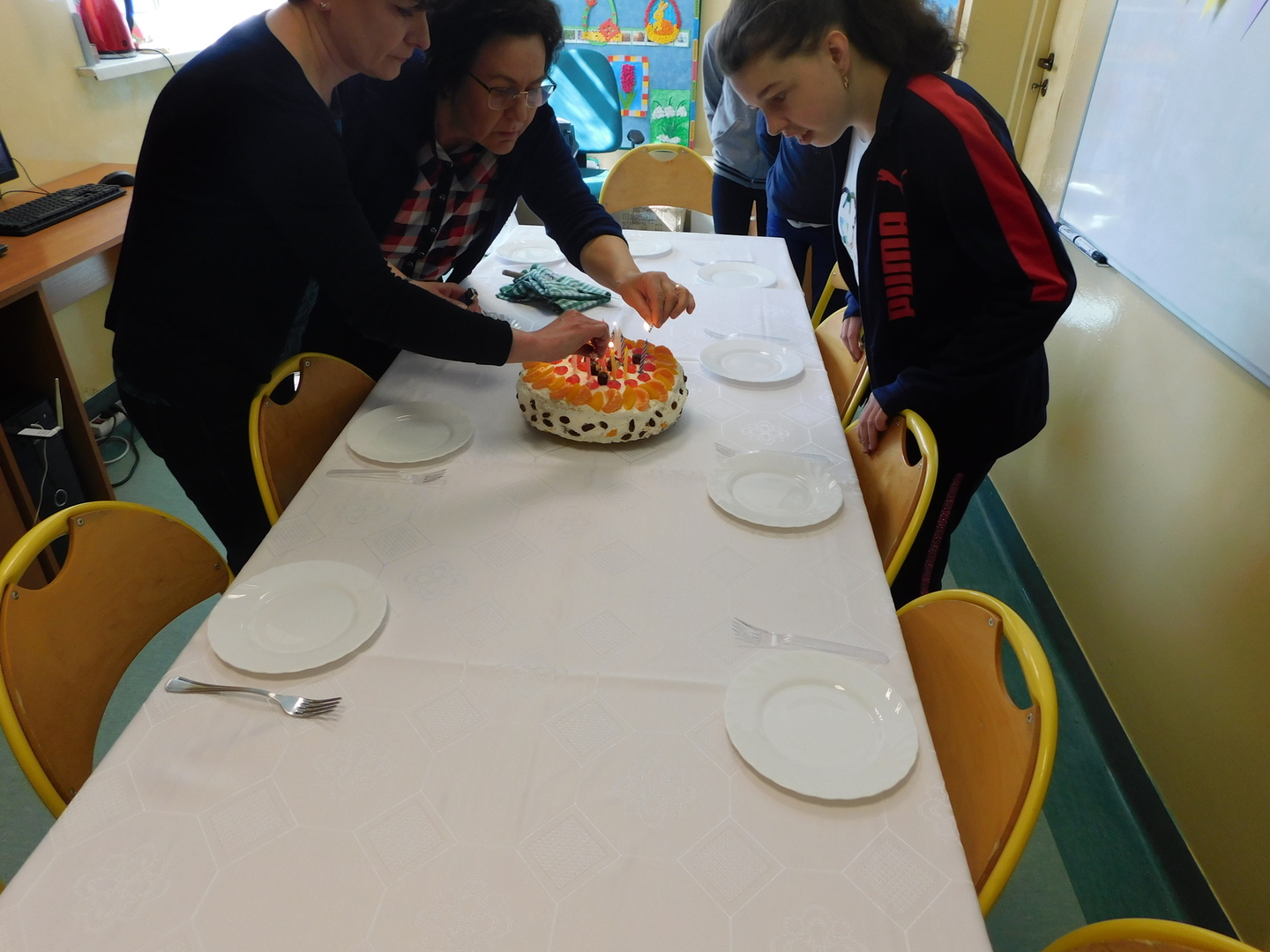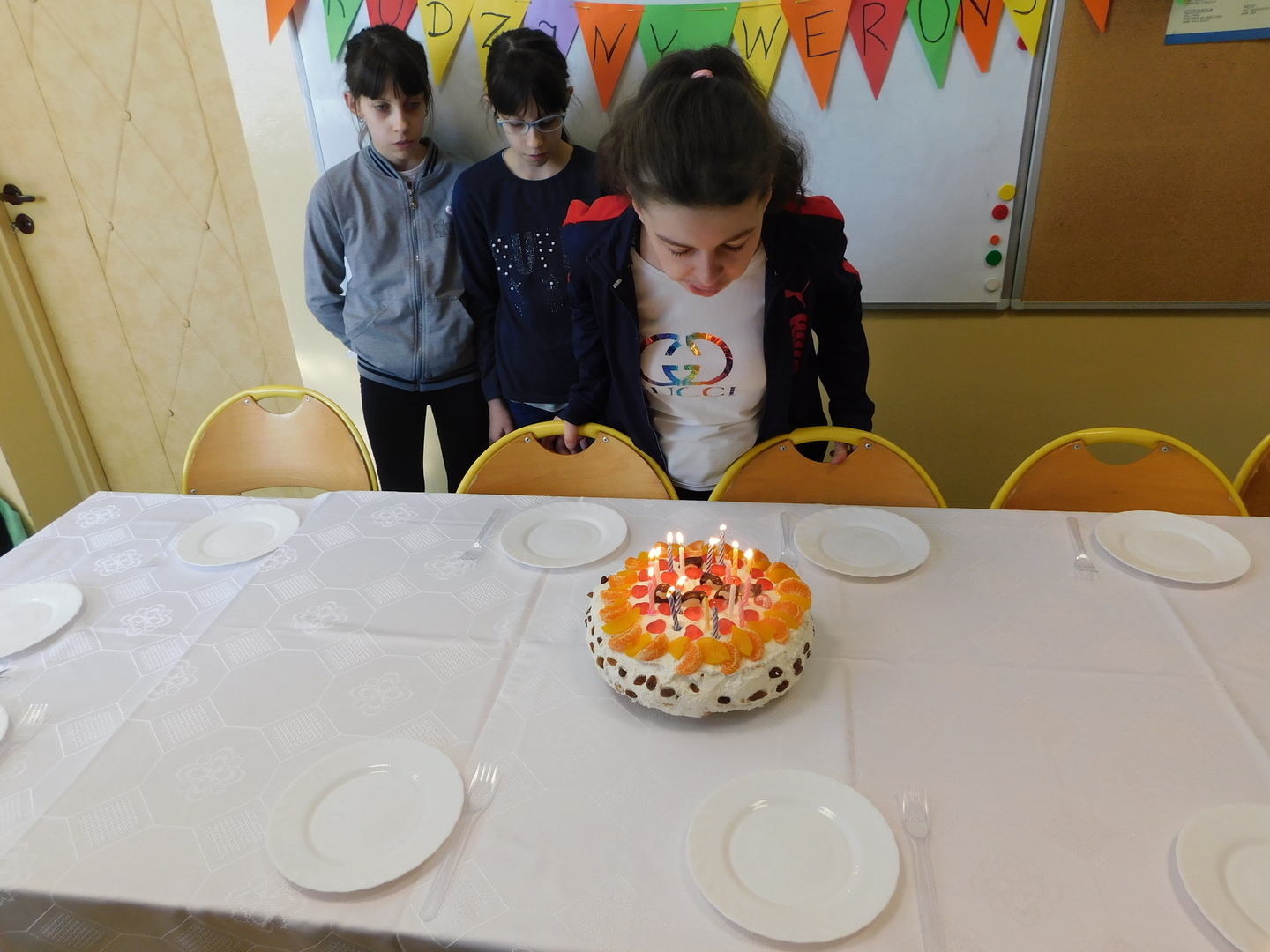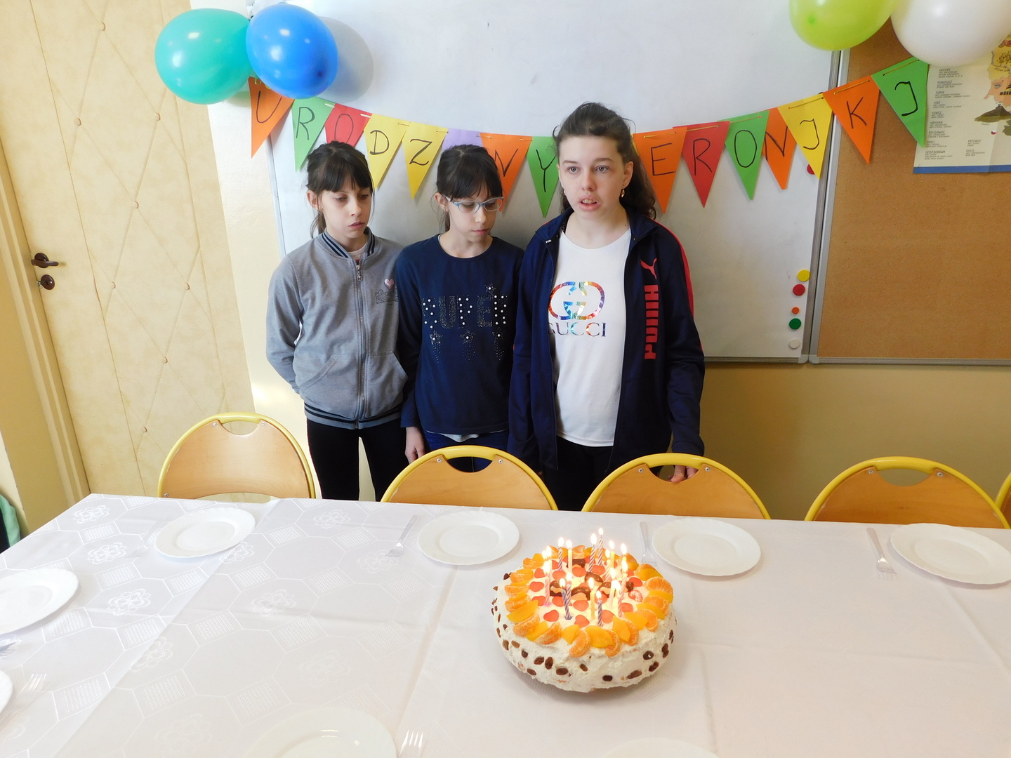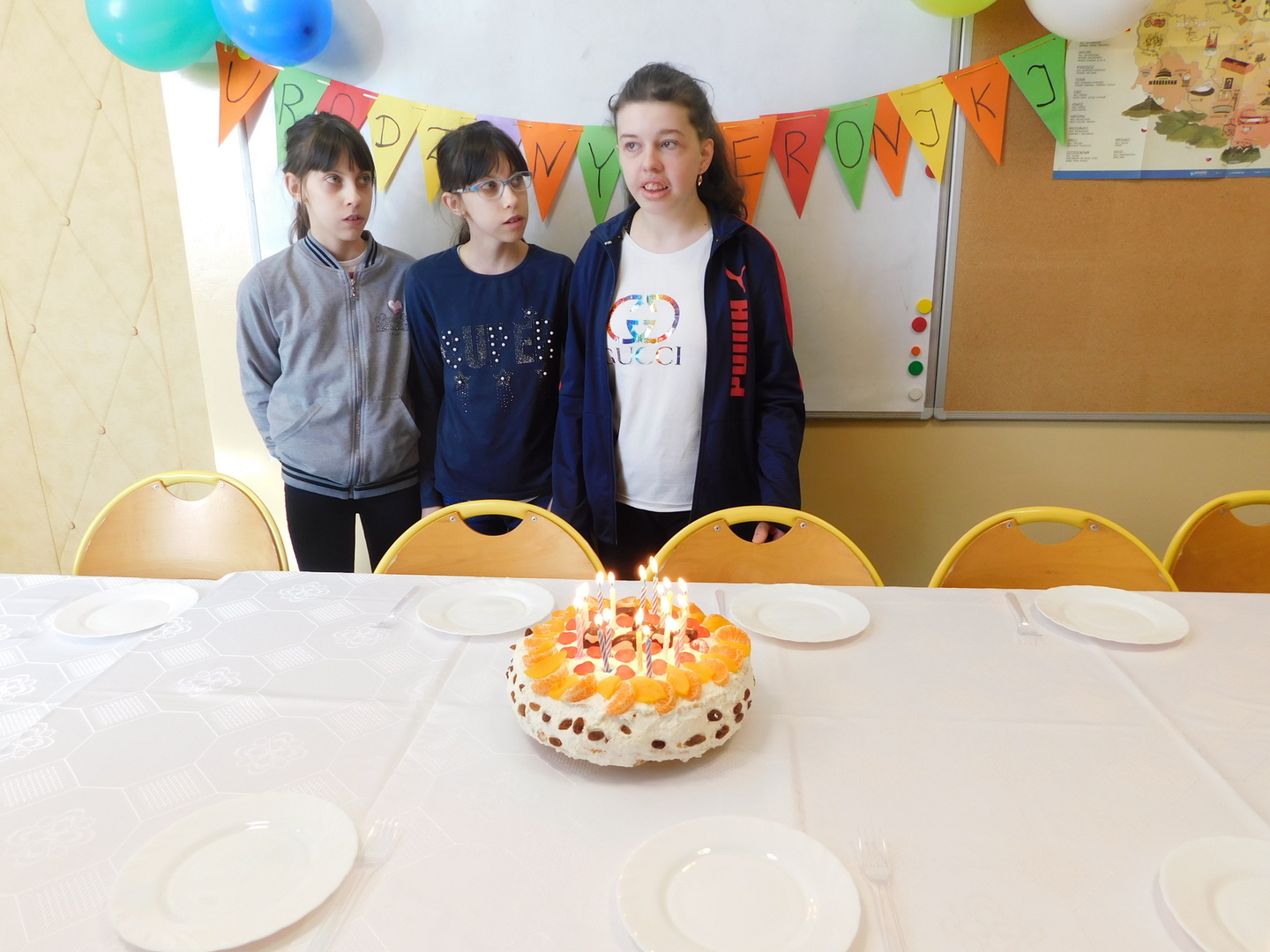 Dziś w naszej szkolnej społeczności obchodziliśmy radosny dzień urodzin Weroniki - uczennicy klasy VII ze specjalnymi potrzebami edukacyjnymi. Z tej okazji Weronika i jej koleżanki z klasy IV przygotowały pyszny tort pod czujnym okiem pani Zofii Waszak. Były życzenia, tradycyjne "Sto lat", upominek i wiele radości.