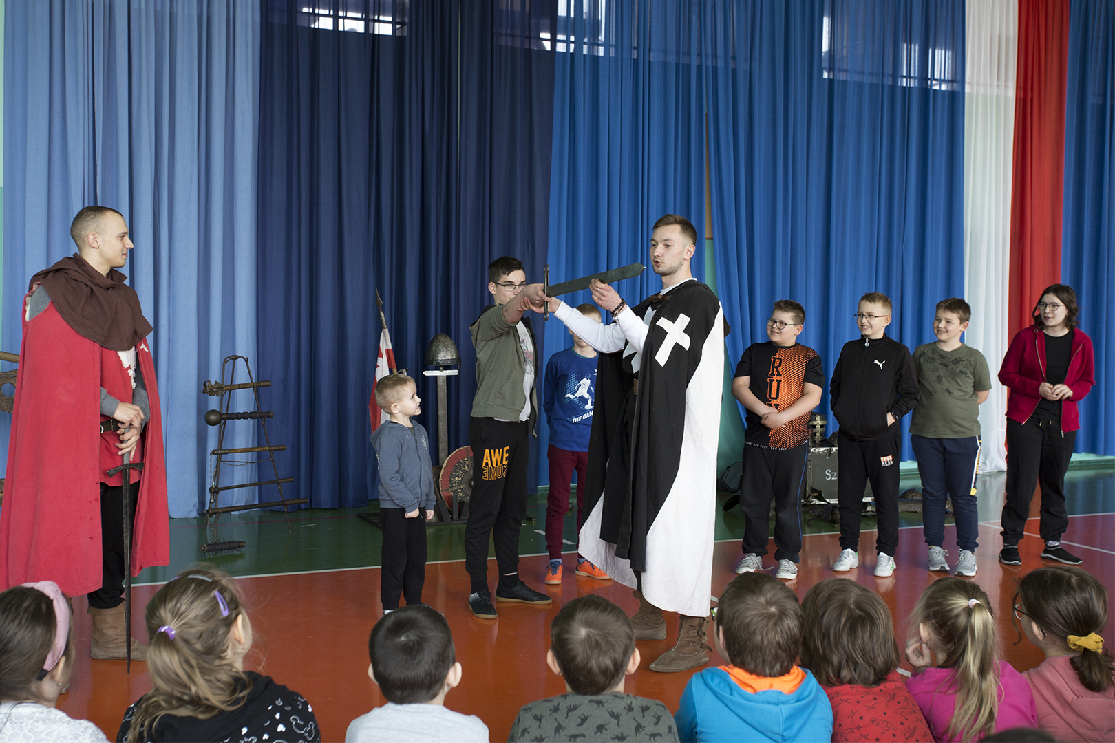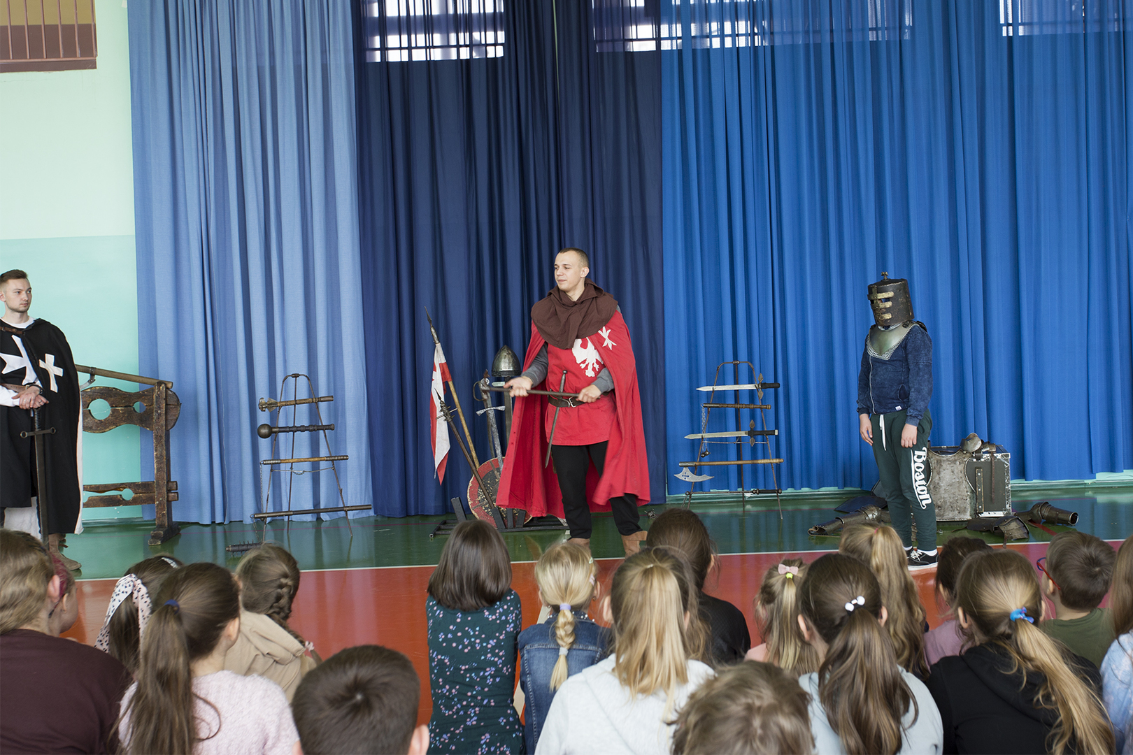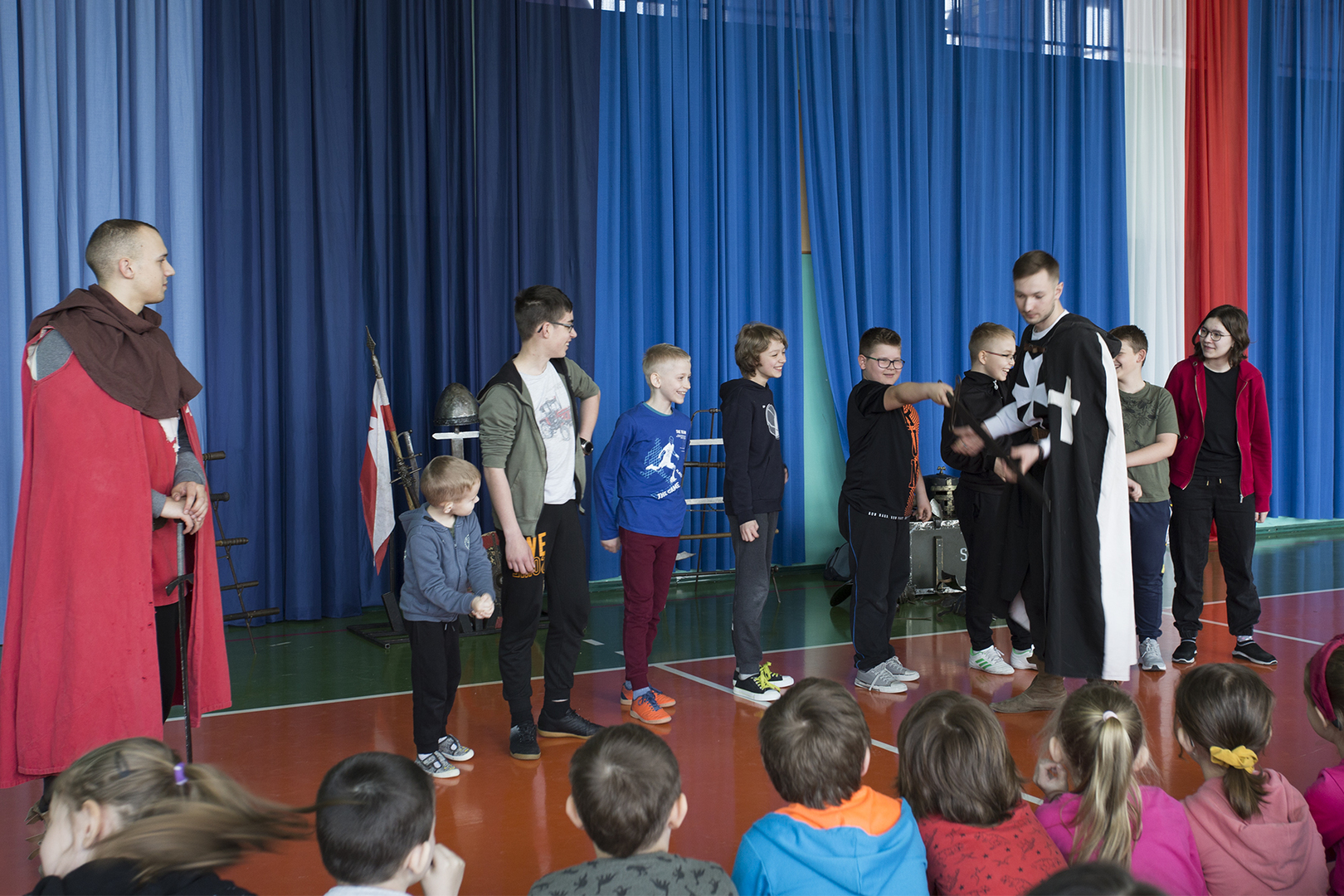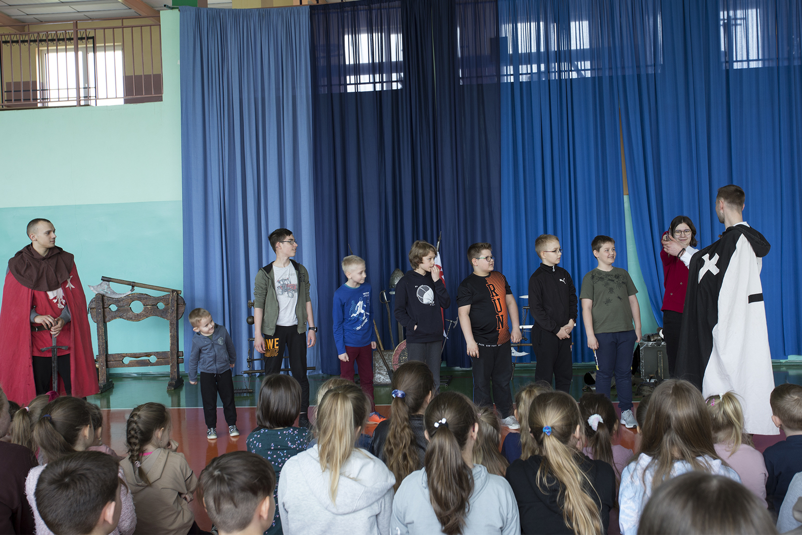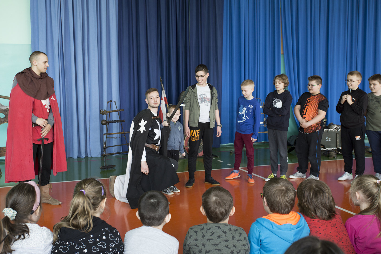 W minioną środę naszą szkołę odwiedziła grupa rekonstrukcyjna ..... Dzięki temu spotkaniu nasi uczniowie mieli okazję poznać zwyczaje średniowiecznego rycerstwa. Dowiedzieli się, jak wyglądał rycerski strój, broń i jak zabiegać o względy wybranki serca. Mogli też zobaczyć średniowieczne narzędzia kar i tortur. Po zakończonym występie każdy uczeń mógł podejść i osobiście dotknąć wszystkich rekwizytów, które zostały im wcześniej zaprezentowane. Właśnie ten moment wywołał najwięcej radości.