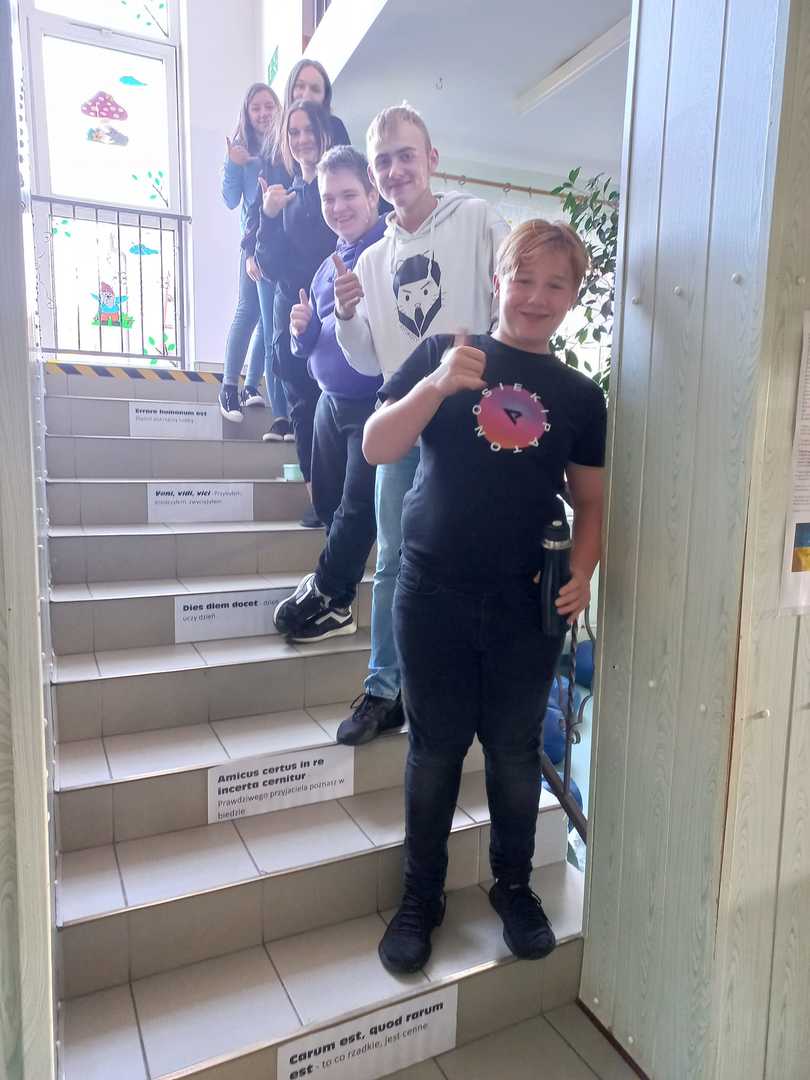Uczniowie klasy ósmej przygotowali zbiór sentencji łacińskich oraz ozdobili nimi szkolne schody. W następnych tygodniach kolejne klasy przystąpią do działań projektowych. Zapowiada się ciekawa podróż edukacyjna po antypodach starożytności. Koordynatorem projektu jest p. Justyna Sztorch.