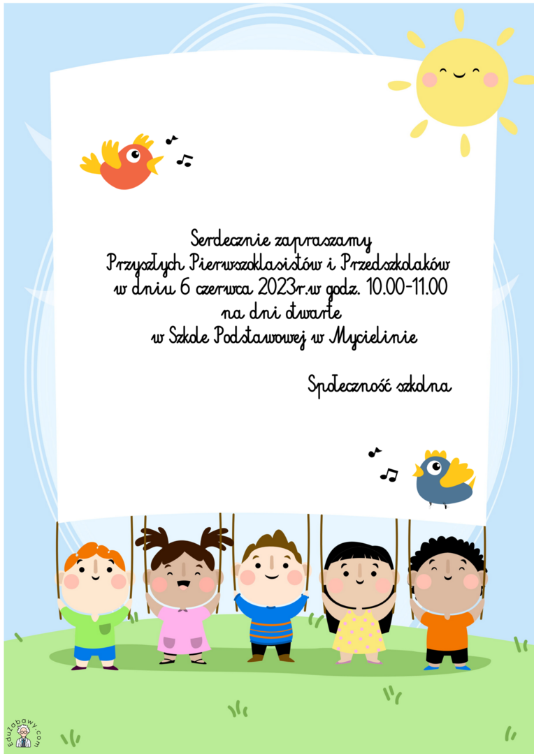 Serdecznie zapraszamy Przyszłych Pierwszoklasistów i Przedszkolaków w dniu 6 czerwca 2023r. w godz. 10.00-11.00 na dni otwarte w Szkole Podstawowej w Mycielinie.