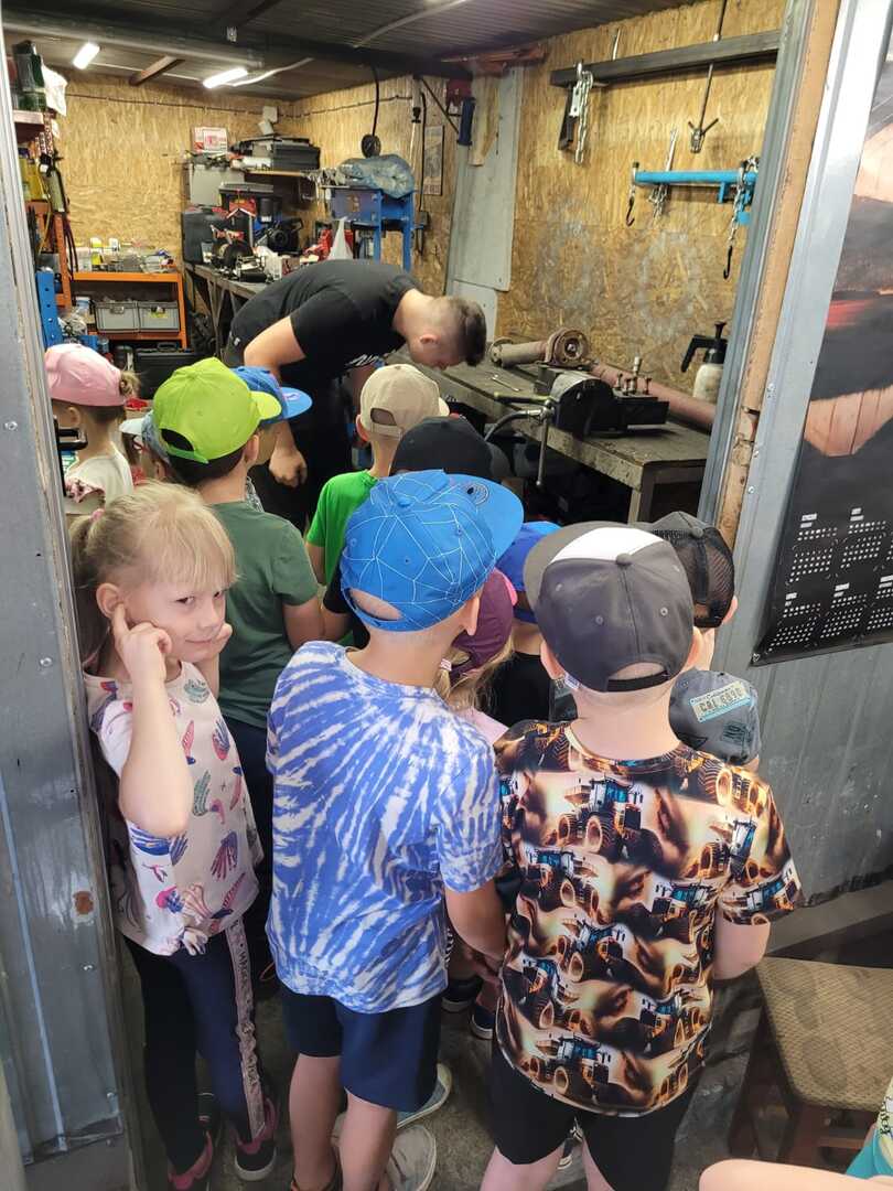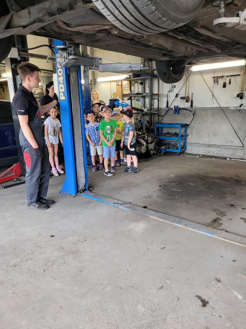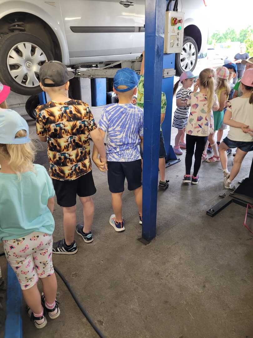 Celem wycieczki było poznanie zawodu mechanika samochodowego. Pan Marcin oprowadził dzieci po swoim warsztacie, pokazując jego wyposażenie. Zobaczyliśmy, jak mechanicy naprawiają auta, uczniowie poznali podstawowe części samochodu oraz narzędzia, które służą do ich naprawy.