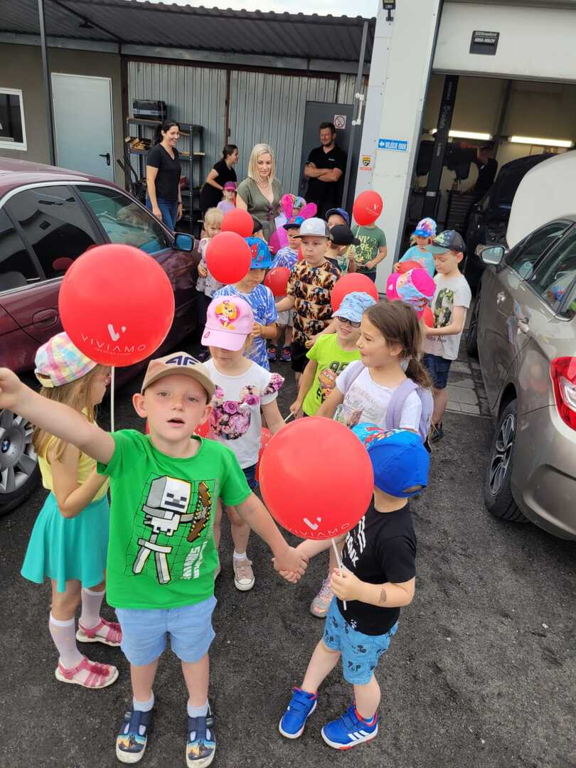 Przedszkolaki pod czujnym okiem swoich Pań udały się na spacer do warsztatu samochodowego.