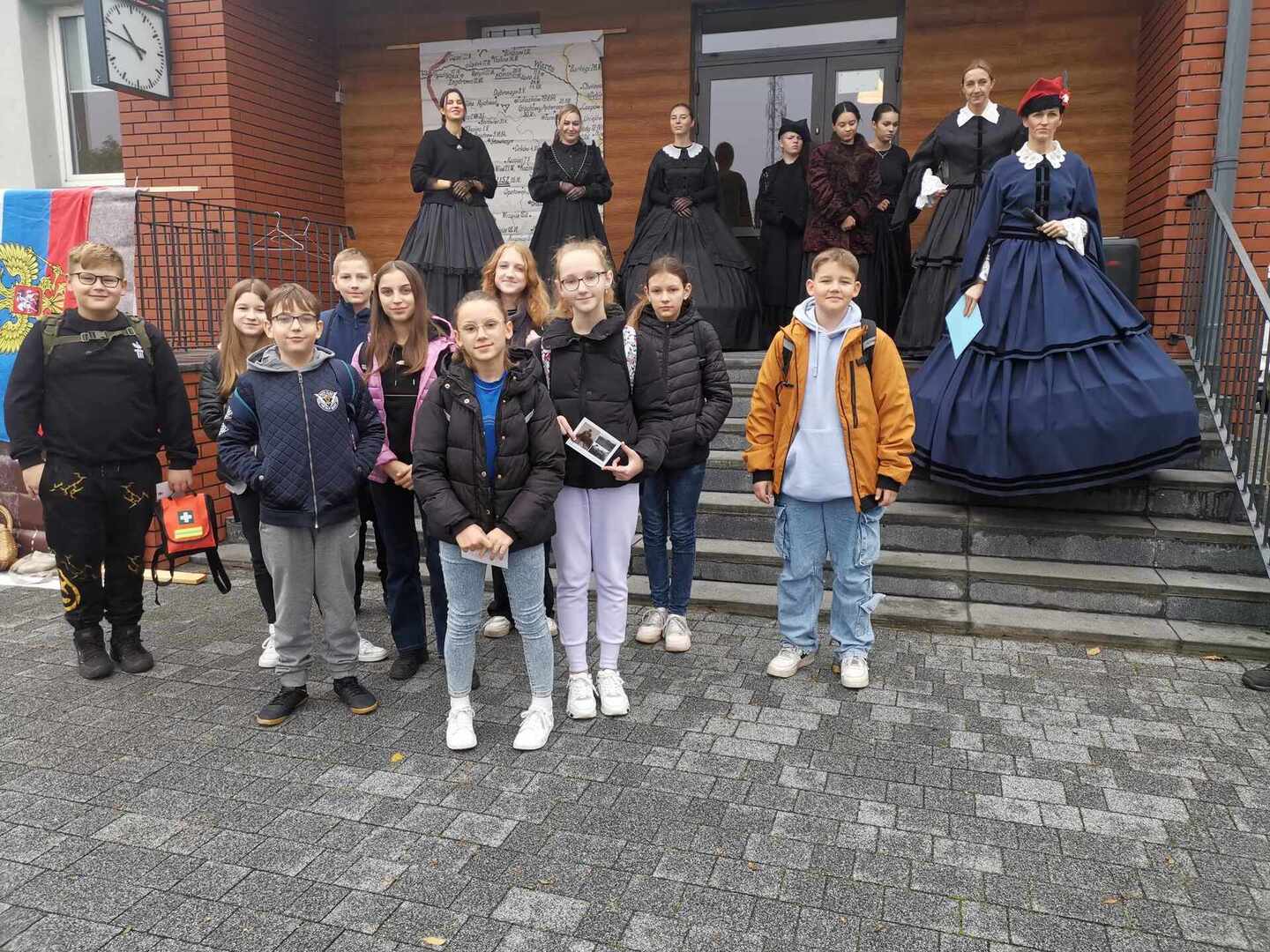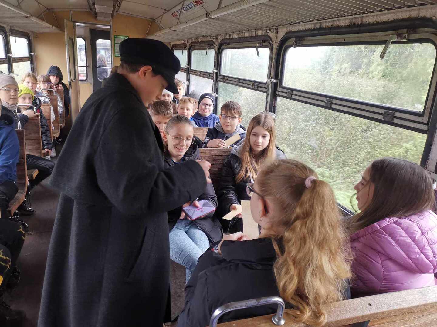Uczniowie z klasy szóstej uczestniczyli dzisiaj w żywej lekcji historii dotyczącej Powstania Styczniowego. Na stacji w Zbiersku byli świadkami scen związanych z początkiem Powstania, mieli okazję obejrzeć elementy umundurowania powstańców oraz suknie z okresu żałoby narodowej. Uczniowie przebyli też trasę Zbiersk – Petryki – Zbiersk zabytkową kaliską kolejką wąskotorową.