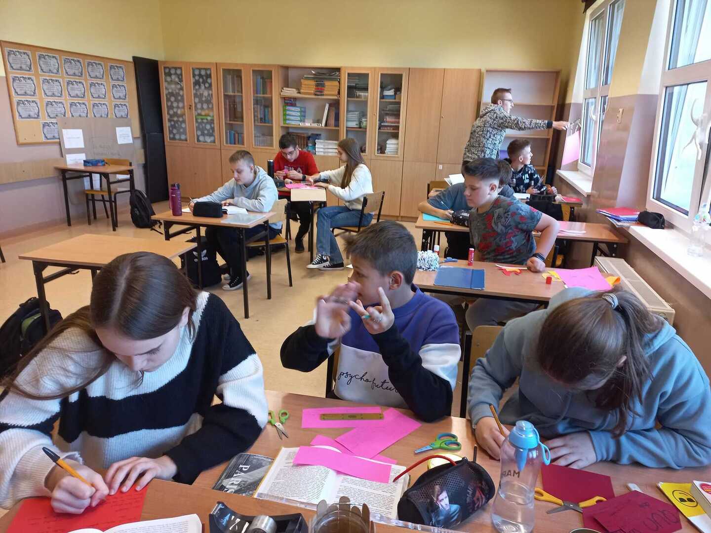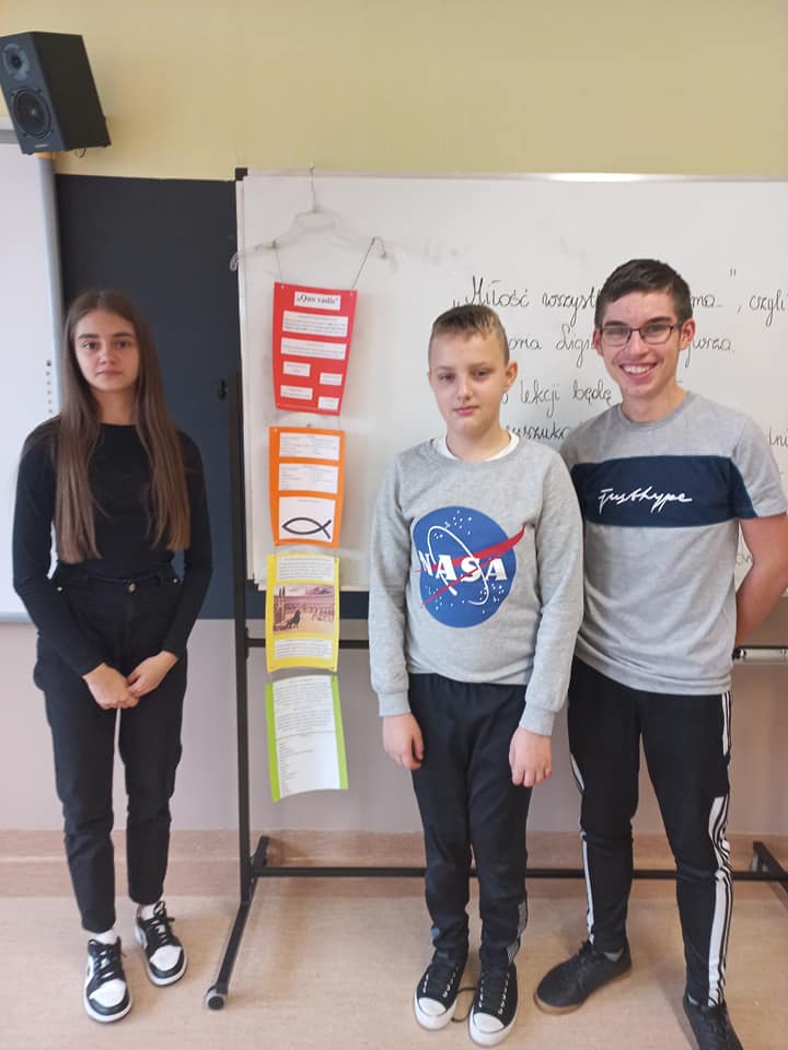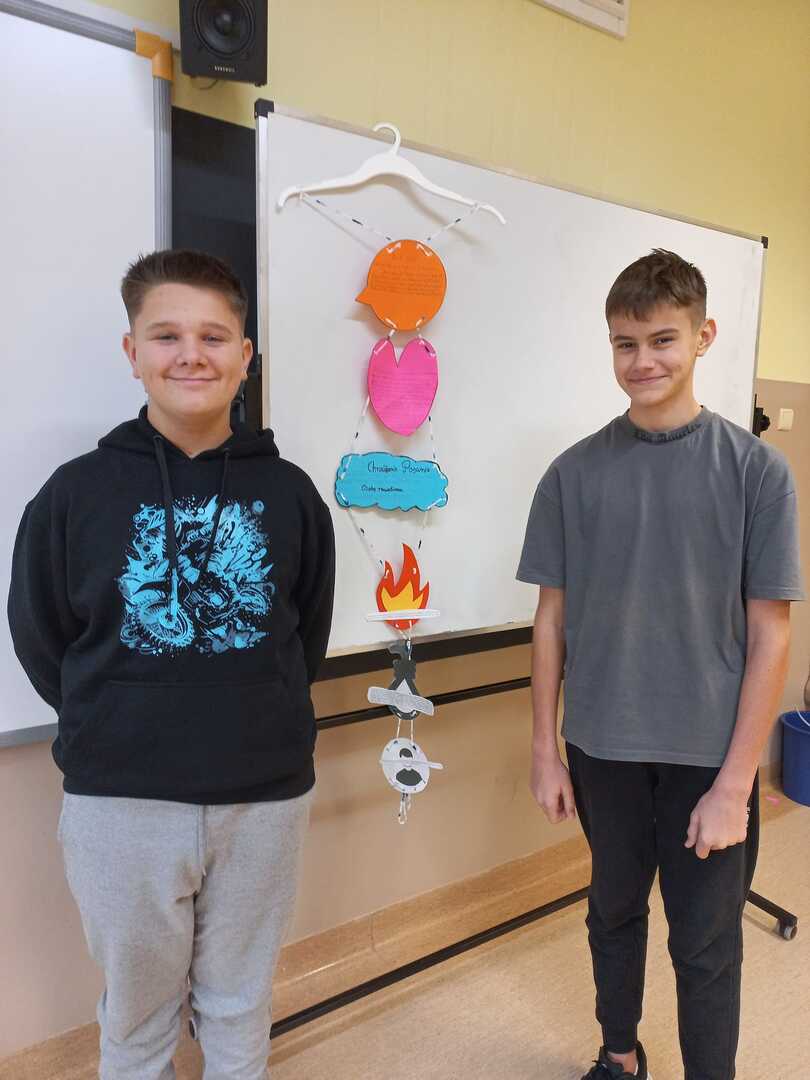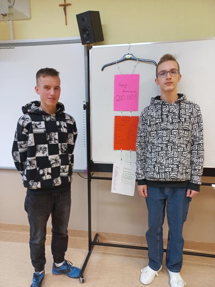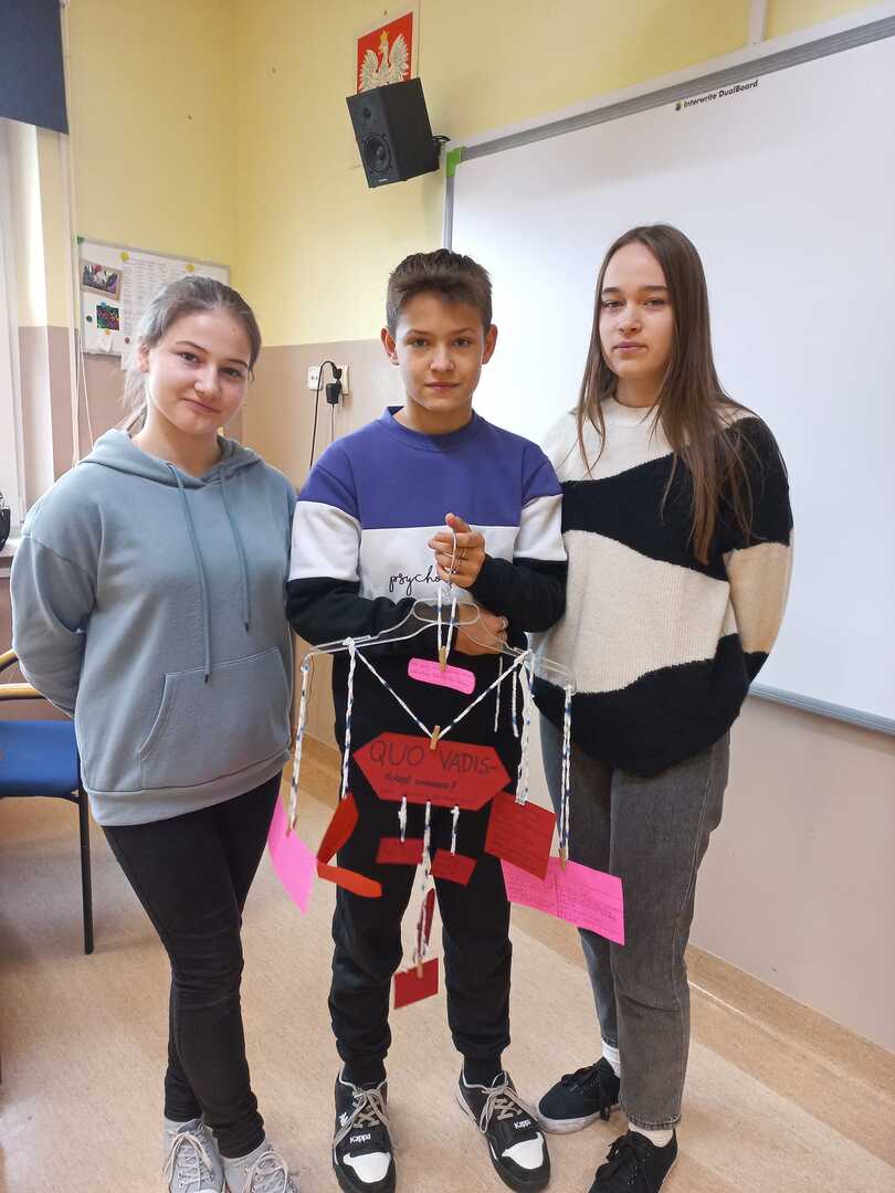 Uczniowie klasy VIII pracowali na lekcjach języka polskiego w bardzo innowacyjny sposób. W trakcie omawiania powieści ,,Quo vadis" zajęli się tworzeniem „lektury na wieszaku”. Jest to ciekawa metoda aktywizująca, dzięki której można zebrać najważniejsze informacje o lekturze (np. o bohaterach, miejscach i czasie akcji, problematyce czy narracji) w nietypowej formie i umieścić je na wieszaku, który staje się dzięki temu mobilnym kompendium wiedzy. Idea „mobilnej książki” przypadła do gustu ósmoklasistom.