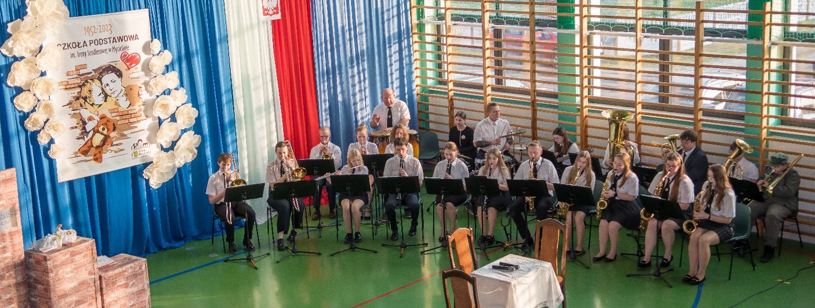 Przybyłych na tę niezwykłą uroczystość powitała dyrektor szkoły- pani Małgorzata Kraszkiewicz, która w swym przemówieniu stwierdziła, że wybór patronki to bardzo istotny moment w życiu każdej placówki. Działania wychowawcze z pewnością będą oparte na wartościach, którymi kierowała się w życiu Irena Sendlerowa i na trwałe wpiszą się w tradycję szkoły. W pięknie przygotowanej sali odbyło się przekazanie sztandaru przez rodziców w składzie Katarzyna Szarnych, Paulina Nicpoń oraz Karol Garnczarek, poświęcenie sztandaru przez proboszcza ks. Mariana Andrzejewskiego, odczytanie stosownych dokumentów przez władze gminy -p. Rafała Szelągowskiego oraz p. Zbigniewa Brajera, a następnie ślubowanie wszystkich uczniów. Doniosłym momentem stało się wspólne odśpiewanie hymnu szkolnego, którego słowa i muzykę napisała p. Arleta Lis, inspiracją był tekst naszej uczennicy- Marty Żarneckiej. Następnie głos zabierali dostojni goście, którzy w ciepłych słowach zwracali uwagę na właściwy wybór postaci patronki. W dalszej części uroczystości dokonano wbicia pamiątkowych gwoździ w drzewiec sztandaru. Mieliśmy okazję wysłuchać wspaniałego repertuaru muzycznego w wykonaniu instrumentalistów z Młodzieżowej Orkiestry Dętej działającej przy OSP Mycielin pod batutą p. Mariusza Trzcińskiego. Wydarzenie zostało podsumowane częścią artystyczną w wykonaniu szkolnych artystów, którzy pod czujnym okiem p. Agnieszki Matuszewskiej, p. Justyny Sztorch oraz p. Anny Jankowskiej przygotowali wyjątkowy montaż słowno – muzyczny,przenosząc wszystkich obecnych do czasów II wojny światowej oraz ważnych wydarzeń z życia patronki. Chór szkolny zwieńczył uroczystość nadania szkole imienia i sztandaru, wyśpiewując dwa utwory muzyczne o tematyce wojennej. Przygotowaniem naszych muzyków zajęła się p. Arleta Lis. Uczniowie naszej szkoły po części oficjalnej mieli możliwość spotkania się z przyjaciółką Ireny Sendlerowej- p. Katarzyną Ludwiniak, która podzieliła się z uczniami swoimi wspomnieniami związanymi z naszą patronką. Ponadto otrzymaliśmy wyjątkowe prezenty związane z życiem Ireny Sendlerowej. Byliśmy zaszczyceni obecnością p. Ludwiniak podczas tegoż wydarzenia. Następnie wszyscy, którzy uczestniczyli w uroczystości zostali zaproszeni na poczęstunek. Nadanie imienia Ireny Sendlerowej Szkole Podstawowej w Mycielinie było wyjątkową uroczystością, która zapisze się trwale w pamięci jej uczestników.