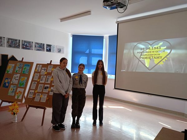 Dziś obchodziliśmy w naszej szkole 81. rocznicę powstania w getcie warszawskim. Już od rana, przed wejściem do budynku harcerze przypinali papierowe żonkile uczniom oraz ich najbliższym.