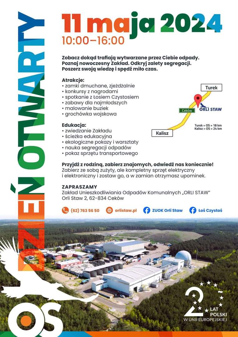 W sobotę 11 maja z okazji 20-lecia członkostwa Polski w Unii Europejskiej, zapraszamy na Dzień Otwarty Zakładu Unieszkodliwiania Odpadów Komunalnych "Orli Staw". W godzinach od 10.00 do 16.00 będzie można zwiedzać obiekty zakładu, poznać metody zagospodarowania odpadów, zaczerpnąć informacji na temat prawidłowej ich segregacji. W programie oprócz elementów edukacyjnych nie zabraknie atrakcji szczególnie dla dzieci i młodzieży takich jak dmuchane zamki, malowanie buziek, konkursy z nagrodami, efektowne eksperymenty, pokazy naukowe, spotkanie z Łosiem Czystosiem i wystawa sprzętu transportowego. W tym dniu będzie można również oddać zużyty, ale kompletny sprzęt elektryczny i elektroniczny, a w zamian otrzymać drobny upominek. Szczegółowe informacje na www.orlistaw.pl oraz profilach FB Łoś Czystoś