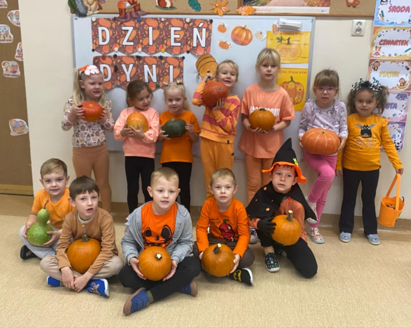 Tego dnia przyniosły do przedszkola dynie i ubrały się na kolor pomarańczowy. Przedszkolaki poznały wielką różnorodność dyń i wzbogaciły wiedzę na ich temat. Dowiedziały się, że dynia jest bardzo zdrowym warzywem i że można przyrządzić z niej wiele dań. Dzieci brały udział w różanych zabawach z udziałem dyni, m.in. dyniowy tor przeszkód, skok przez dynie, slalom dyniowy. Przedszkolaki wykonały pracę plastyczną -mozaikową dynie. A na koniec mogły własnoręcznie wydrążyć dynie z miąższu i pestek.
