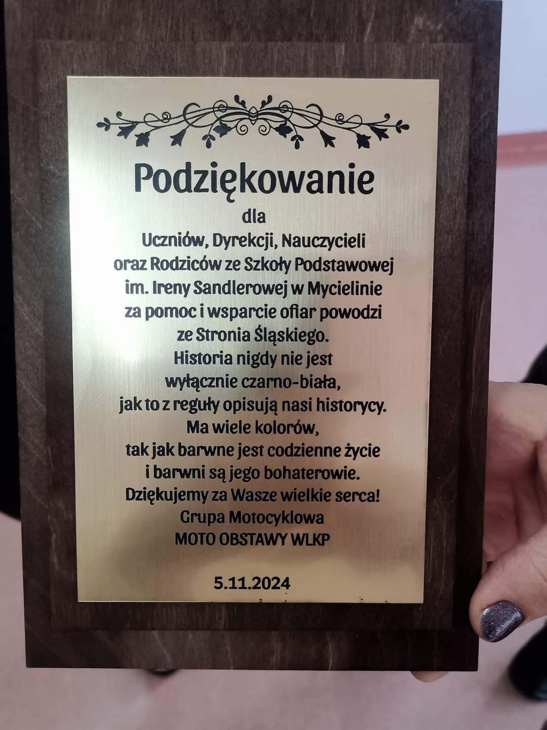 W dowód wdzięczności motocykliści wręczyli uczniom drobne upominki oraz złożyli piękne podziękowanie w formie pamiątkowej tabliczki, skierowane do Uczniów, Rodziców i Nauczycieli.