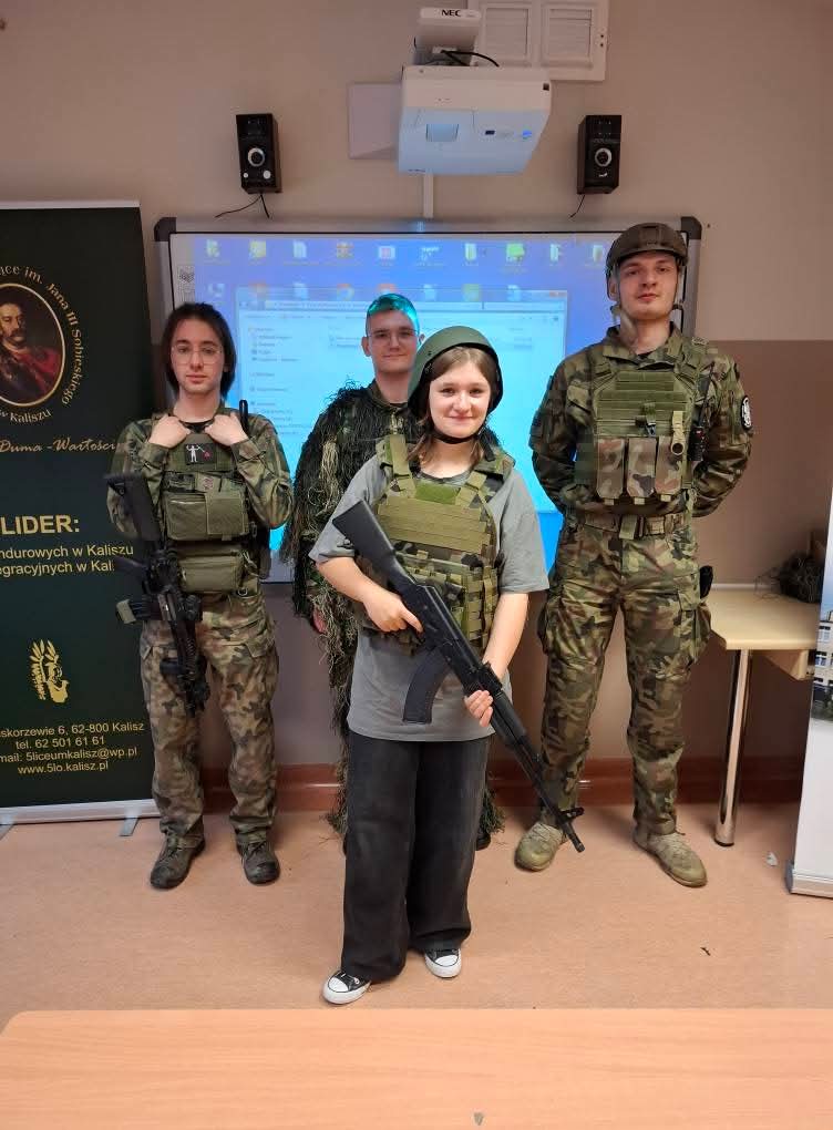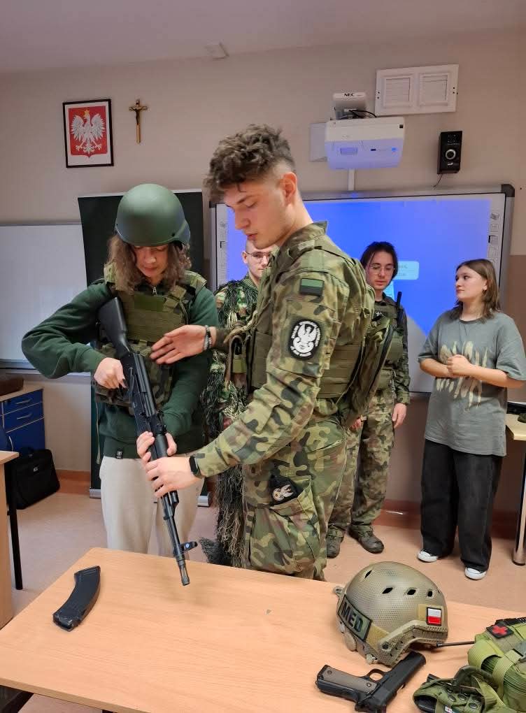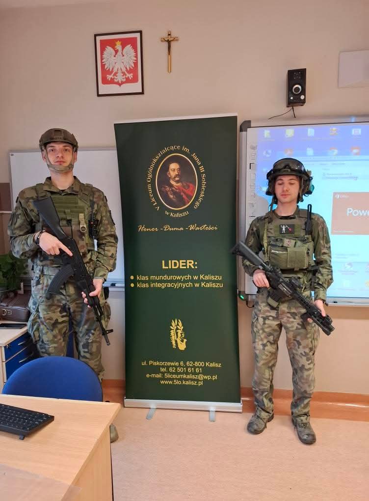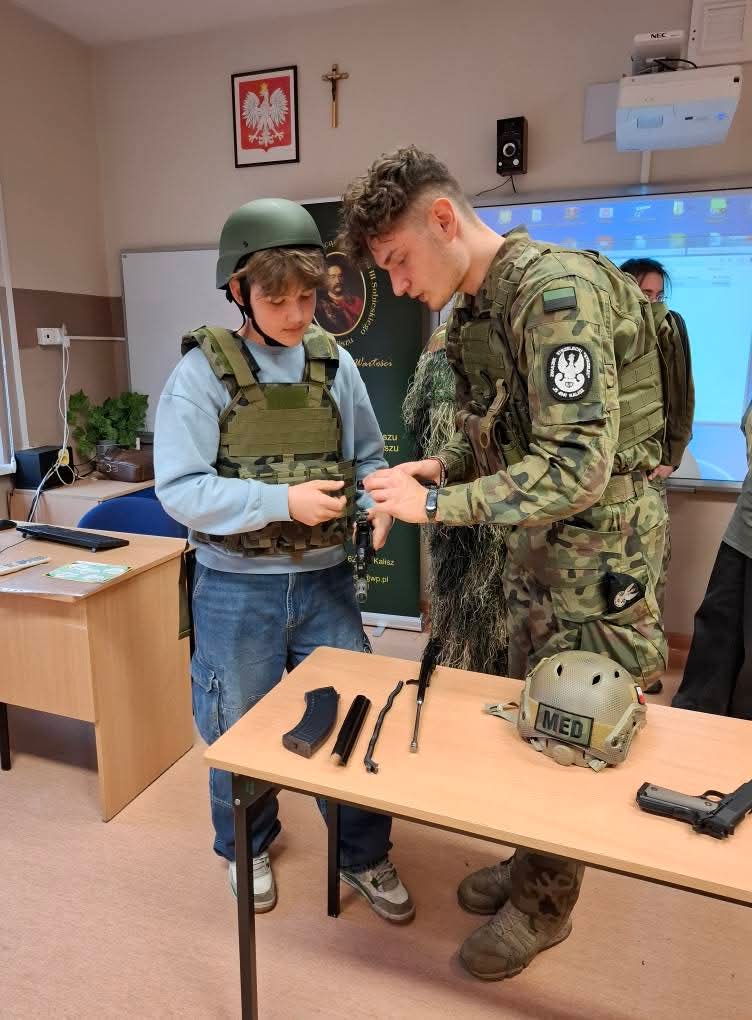 Dzisiaj gościliśmy w naszej szkole uczniów klasy mundurowej V Liceum Ogólnokształcącego im. Jana III Sobieskiego w Kaliszu. Licealiści przedstawili siódmo-i ósmoklasistom ofertę edukacyjną, którą ich szkola przygotowała na rok szkolny 2025/2026 oraz wskazali, na czym polega wyjątkowość tej oferty. Nasi uczniowie mieli też okazję popróbować swoich sił w składaniu i rozkładaniu broni. Dziękujemy naszym gościom za wizytę!