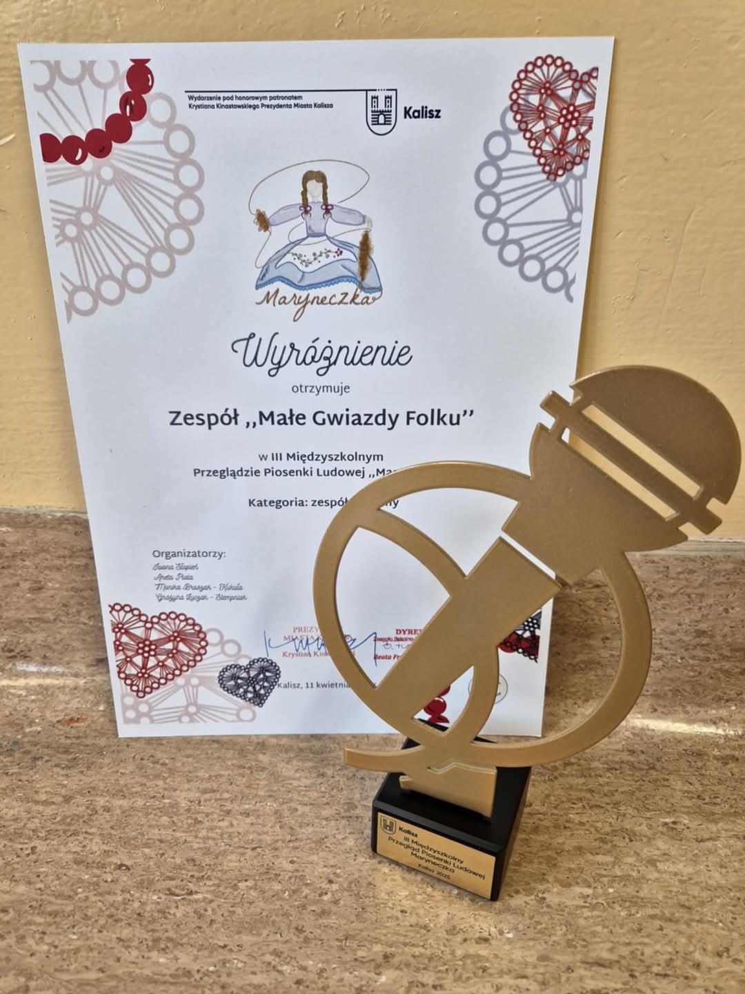 11 kwietnia w Szkole Podstawowej nr 22 im. Józefa Piłsudskiego w Kaliszu odbył się lll Międzyszkolny Przegląd Piosenki Ludowej ,,Maryneczka". W przeglądzie zaprezentowały się szkoły z Kalisza i powiatu kaliskiego. Naszą szkołę reprezentowały dzieci z klasy II : Lena Janiak, Zuzanna Kaczkowska, Maria Wypych, Leon Sztorch, Franciszek Kozyra i Franciszek Waszak, wykonując utwór ,,Czerwone jabłuszko". Uczniowie otrzymali wyróżnienie oraz statuetkę za udział w konkursie. Uczniów przygotowywała p. Agata Gąda.