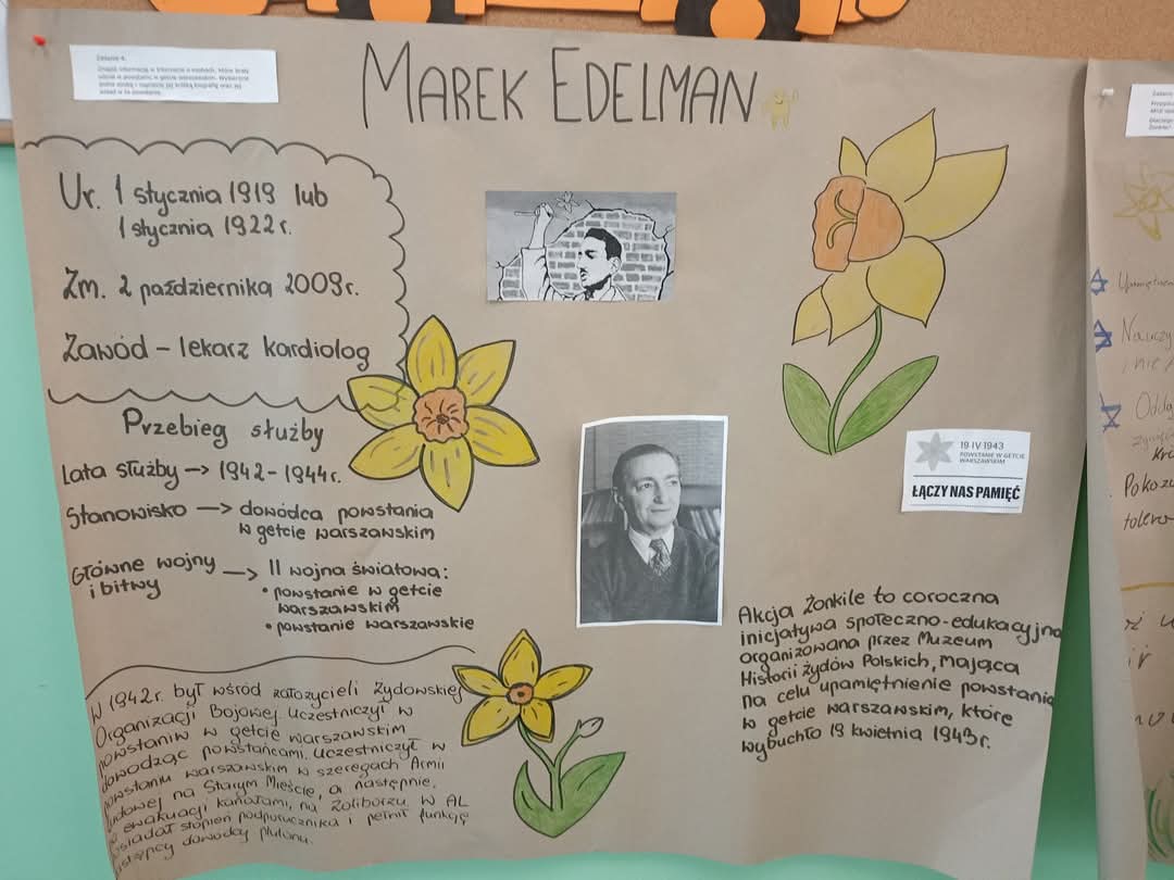 Akcja Żonkile to coroczna inicjatywa organizowana przez Muzeum Historii Żydów Polskich Polin, mająca na celu upamiętnienie powstania w getcie warszawskim z 1943 roku. Jej głównym symbolem jest żonkil – kwiat, który przypomina o odwadze i pamięci bohaterów tamtych wydarzeń. Uczniowie ze starszych klas aktywnie uczestniczyli dziś w tej akcji poprzez udział w prelekcji o losach Żydów podczas II wojny światowej oraz wykonanie zadań dotyczących powstania w getcie, pracując przy tym w zespołach klasowych.
