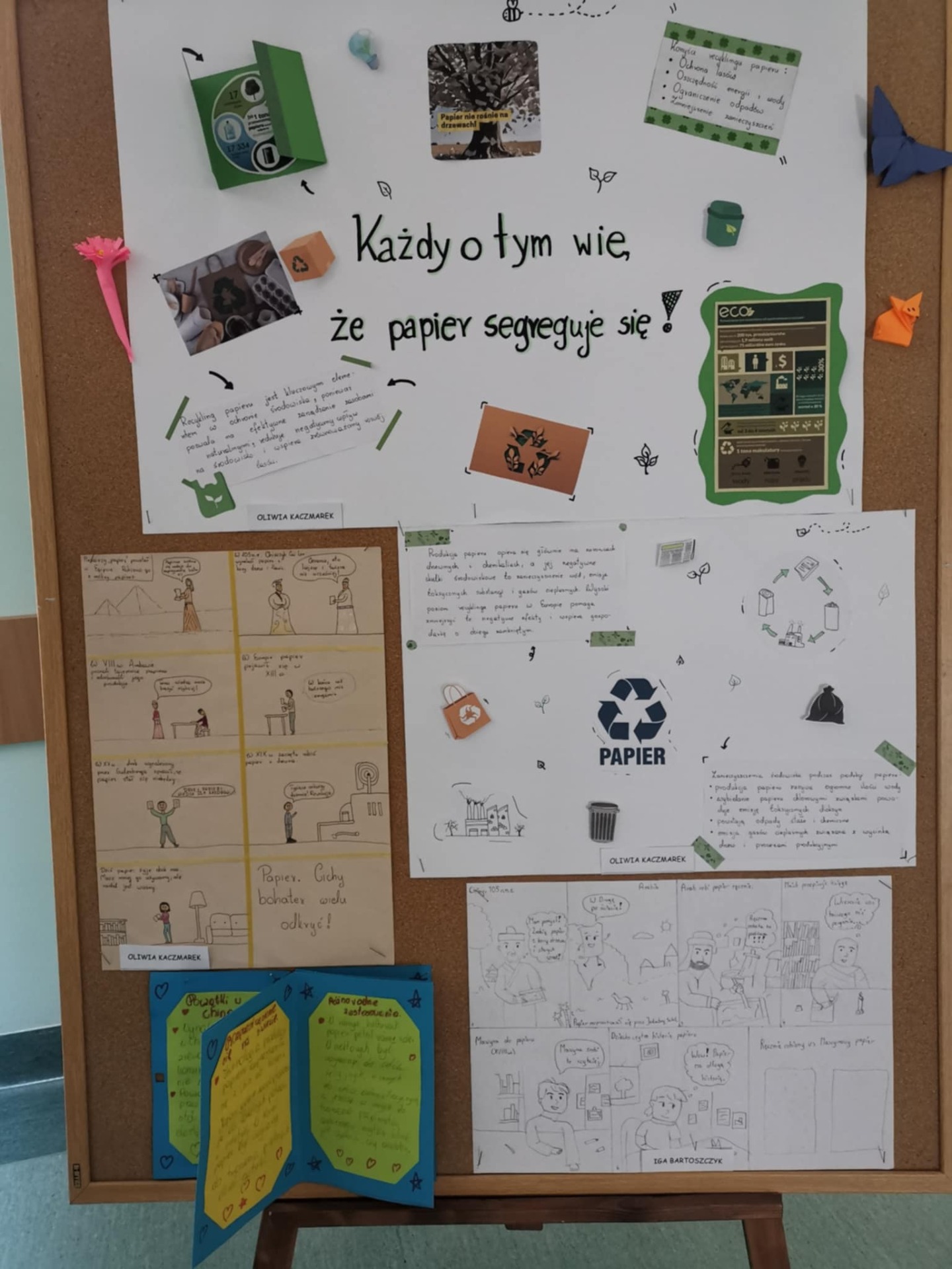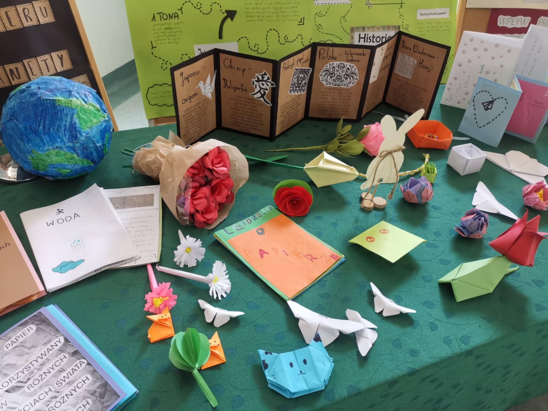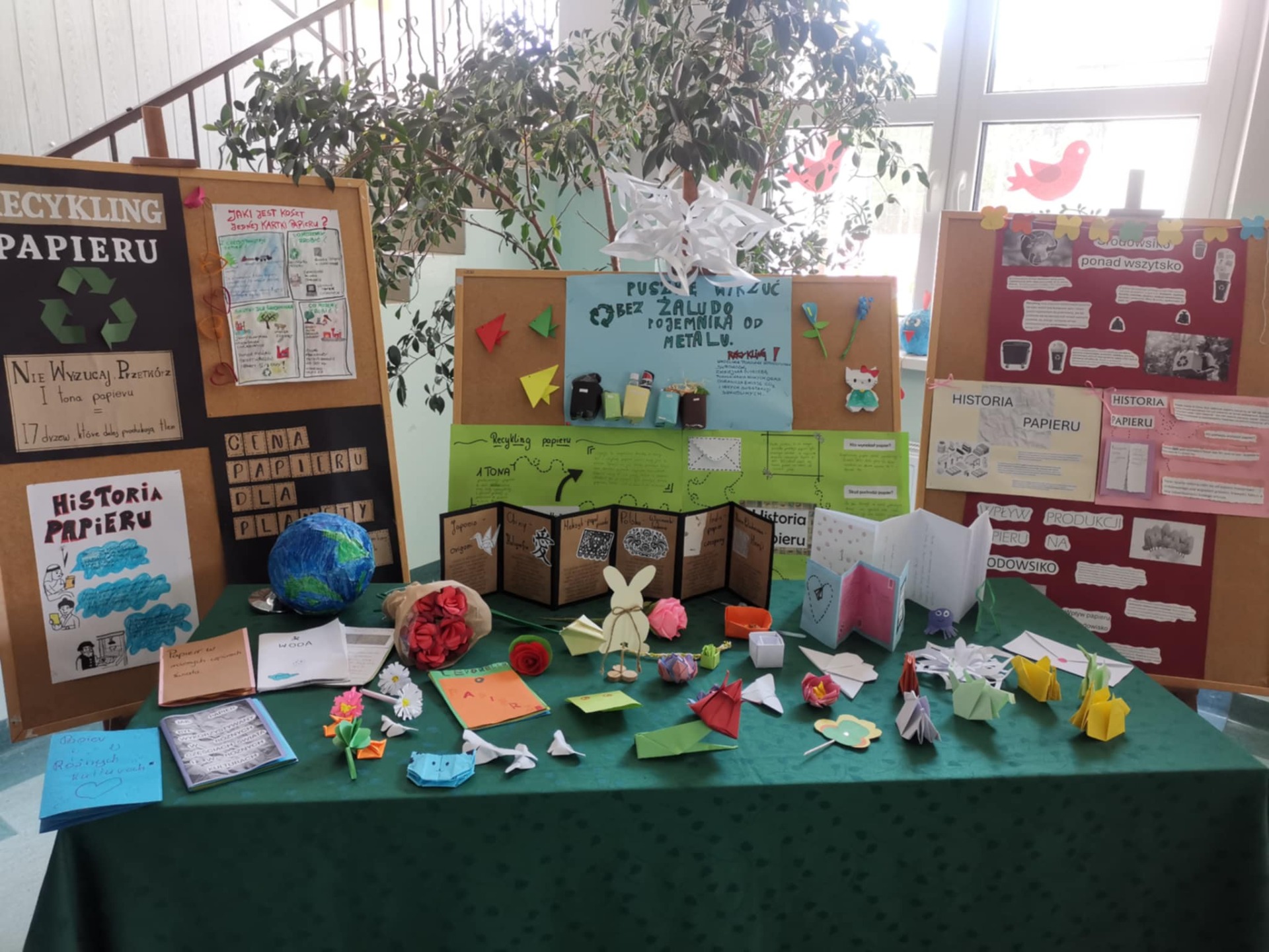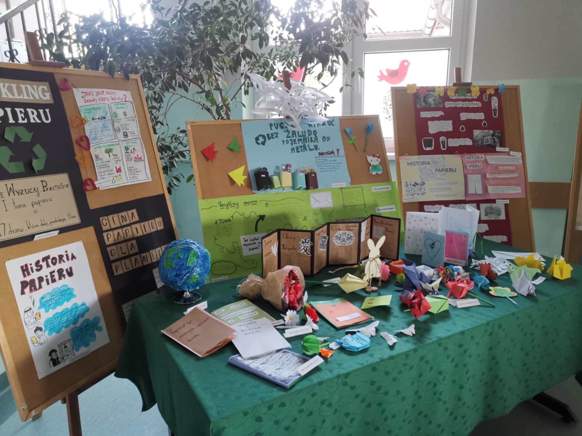 W tym roku szkolnym uczniowie klas 4–8 wzięli udział w szkolnym projekcie ekologicznym „Czas na papier” w ramach programu „Kaliska Przygoda z Odpadami”. W pięciu zadaniach przygotowali komiks o historii papieru, wykonali papierowe ozdoby, stworzyli plakaty obrazujące wpływ produkcji na środowisko oraz promujące recykling, a także leporello o zastosowaniach papieru w różnych kulturach. Efektem pracy są kreatywne realizacje i wzrost świadomości ekologicznej wśród młodzieży.