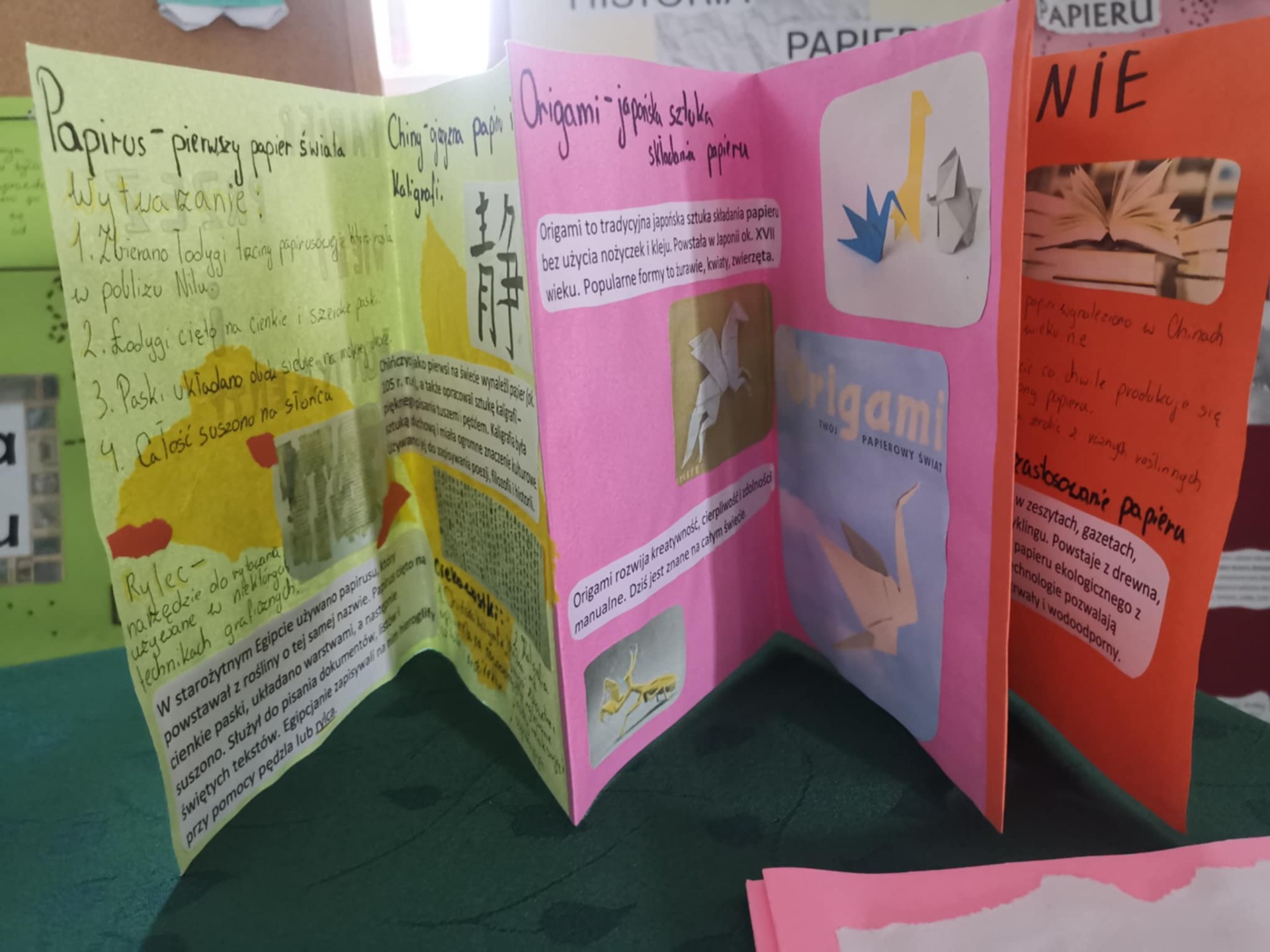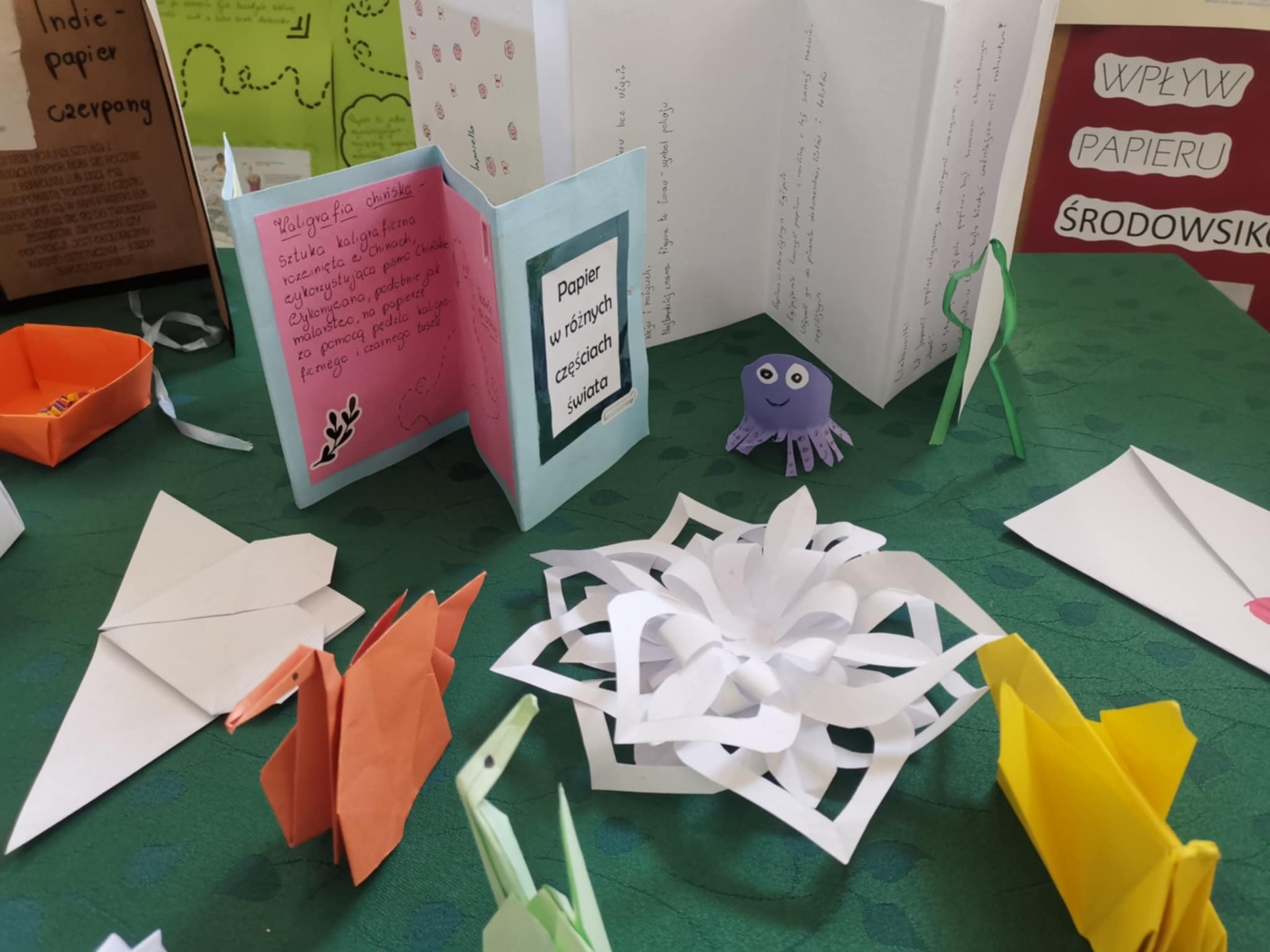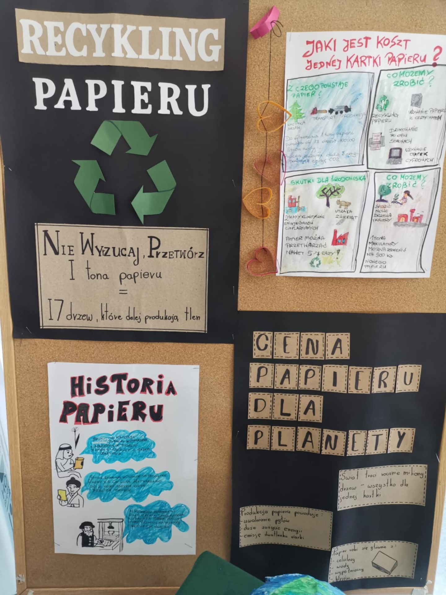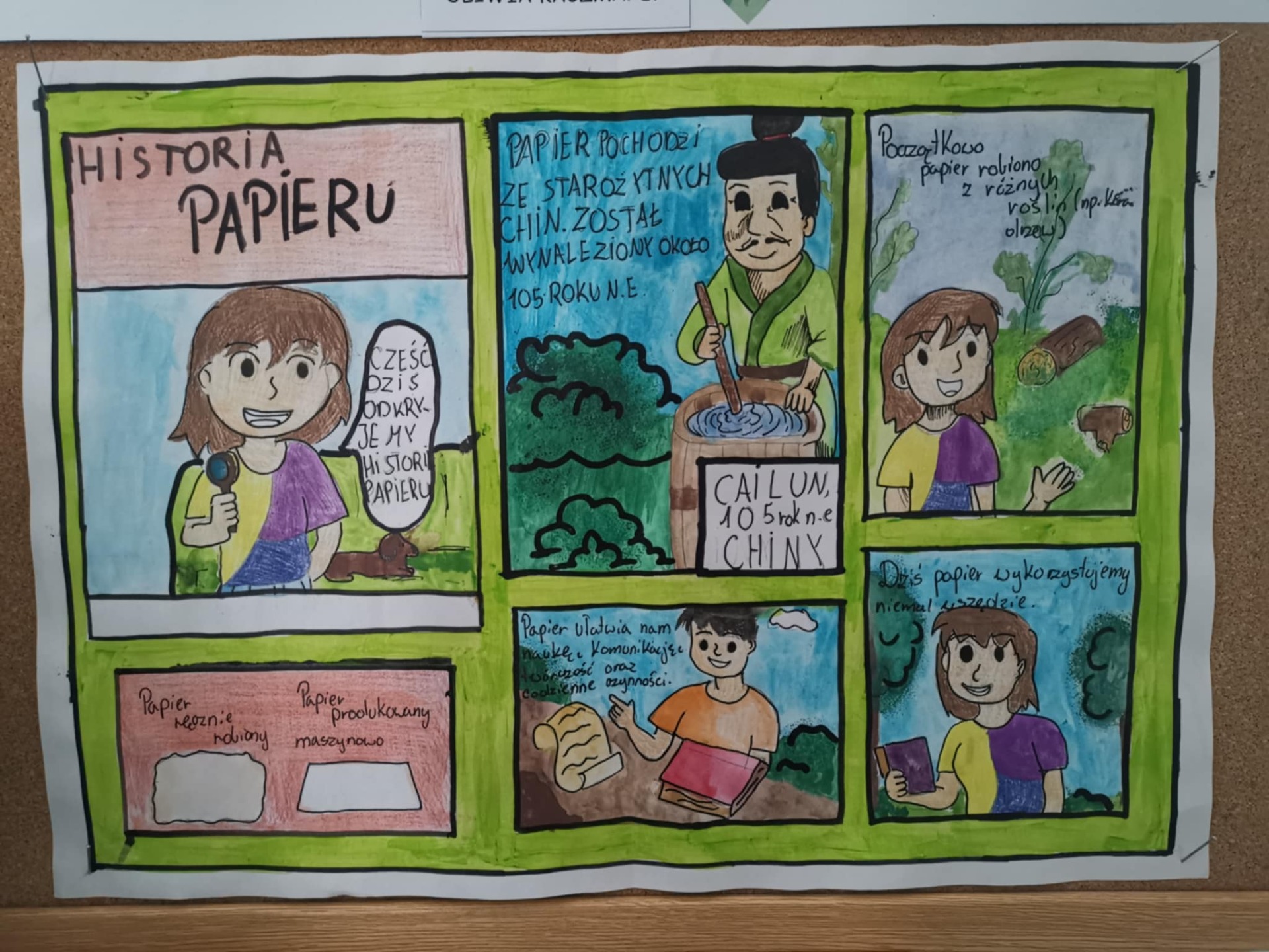 W tym roku szkolnym uczniowie klas 4–8 wzięli udział w szkolnym projekcie ekologicznym „Czas na papier” w ramach programu „Kaliska Przygoda z Odpadami”. W pięciu zadaniach przygotowali komiks o historii papieru, wykonali papierowe ozdoby, stworzyli plakaty obrazujące wpływ produkcji na środowisko oraz promujące recykling, a także leporello o zastosowaniach papieru w różnych kulturach. Efektem pracy są kreatywne realizacje i wzrost świadomości ekologicznej wśród młodzieży.