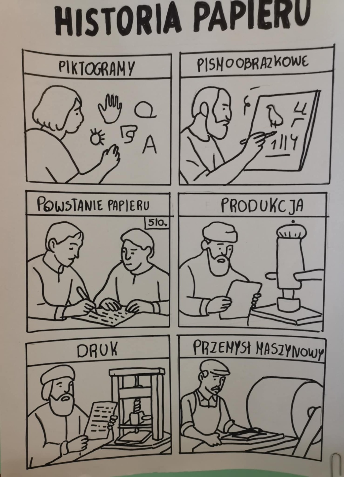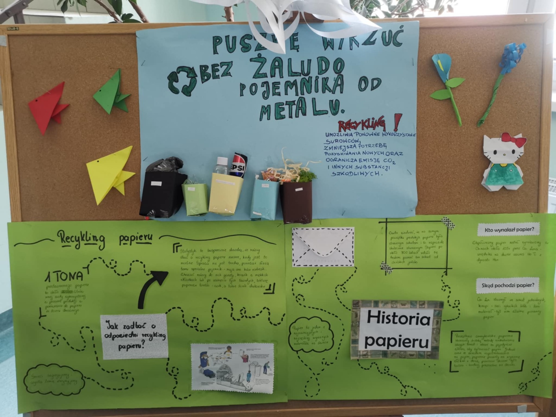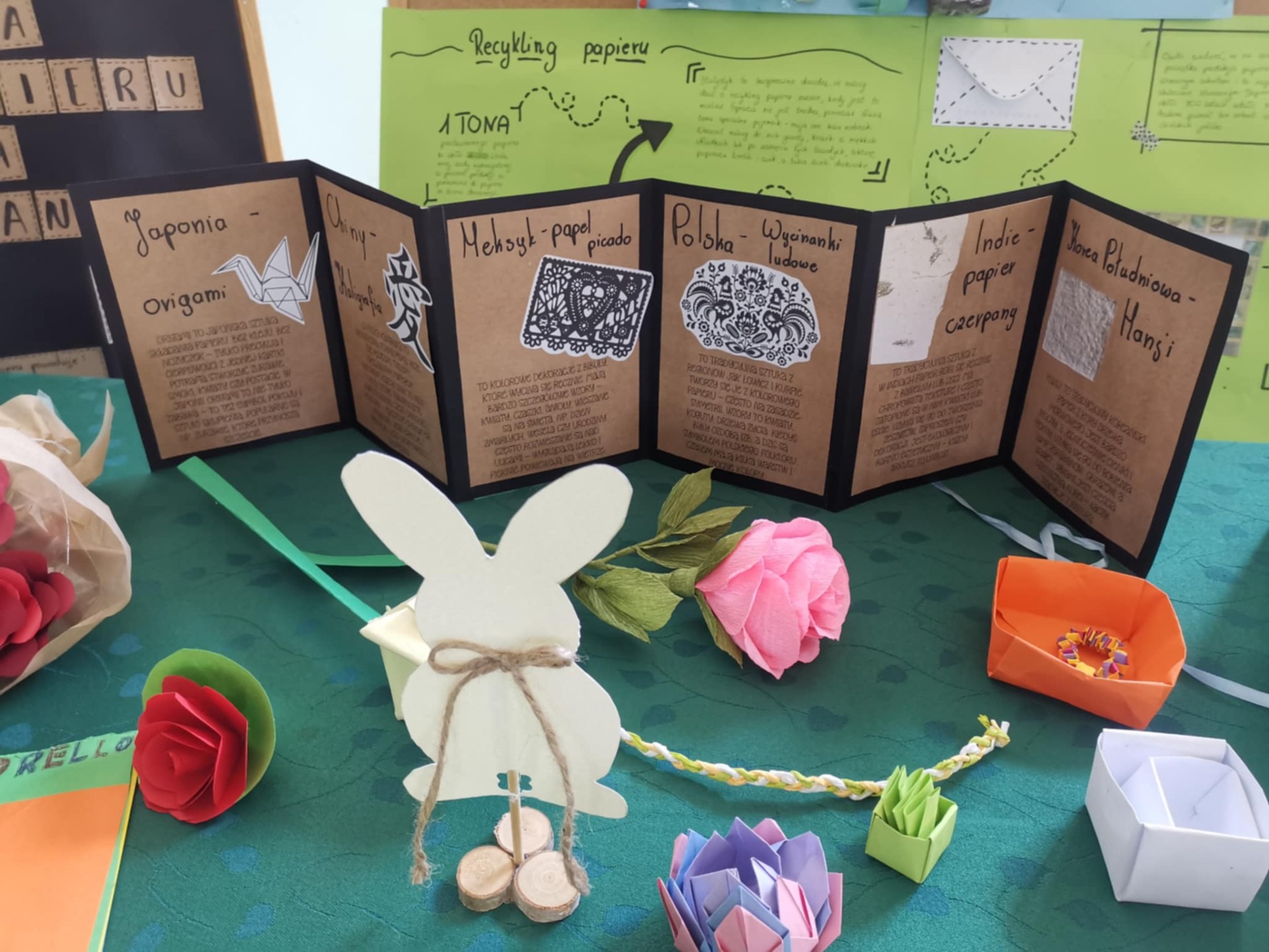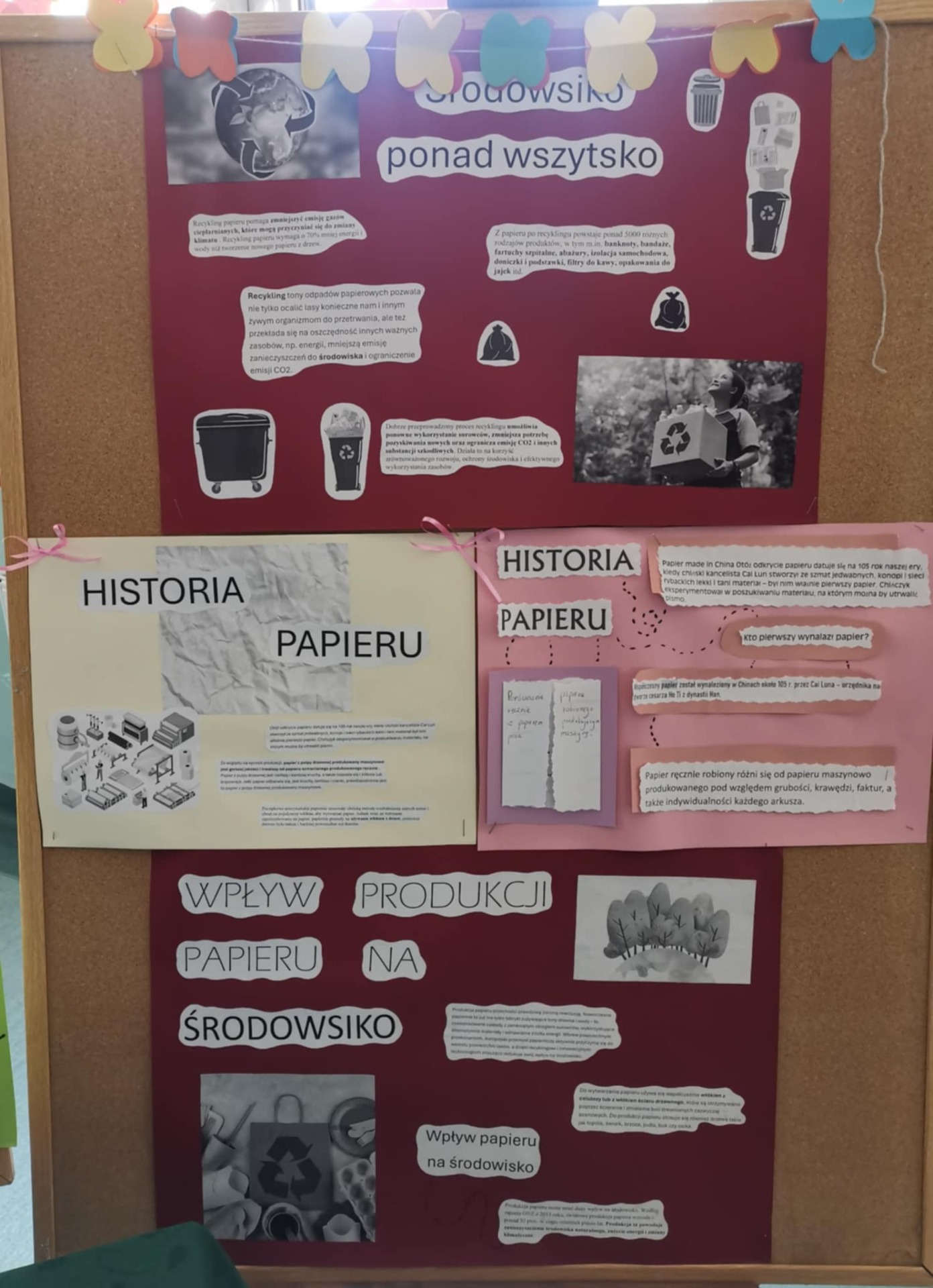 W tym roku szkolnym uczniowie klas 4–8 wzięli udział w szkolnym projekcie ekologicznym „Czas na papier” w ramach programu „Kaliska Przygoda z Odpadami”. W pięciu zadaniach przygotowali komiks o historii papieru, wykonali papierowe ozdoby, stworzyli plakaty obrazujące wpływ produkcji na środowisko oraz promujące recykling, a także leporello o zastosowaniach papieru w różnych kulturach. Efektem pracy są kreatywne realizacje i wzrost świadomości ekologicznej wśród młodzieży.