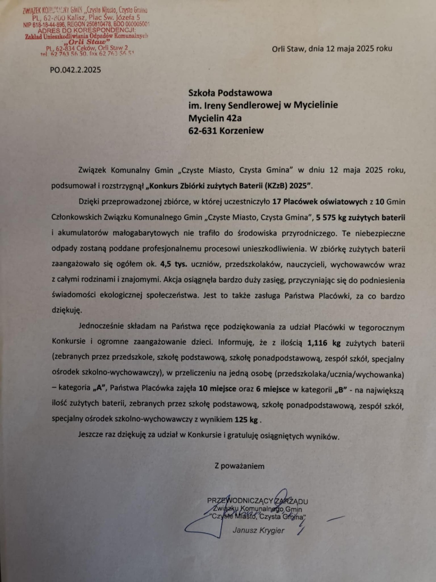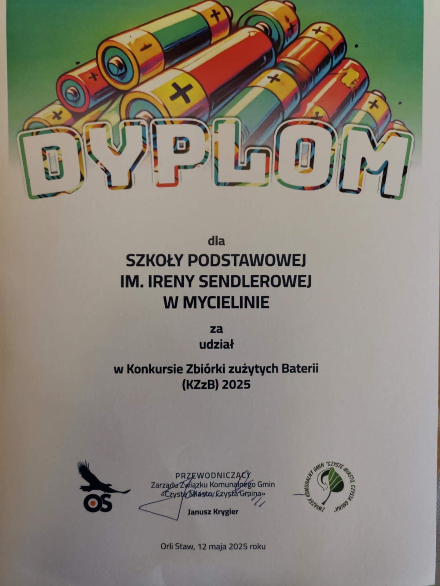 Z dumą informujemy, że nasi uczniowie wzięli udział w konkursie zbiórki zużytych baterii, którego organizatorem jest Związek Komunalny Gmin "Czyste Miasto, Czysta Gmina". Zebraliśmy łącznie aż 125 kg baterii, co daje 1,116 kg na jednego ucznia!