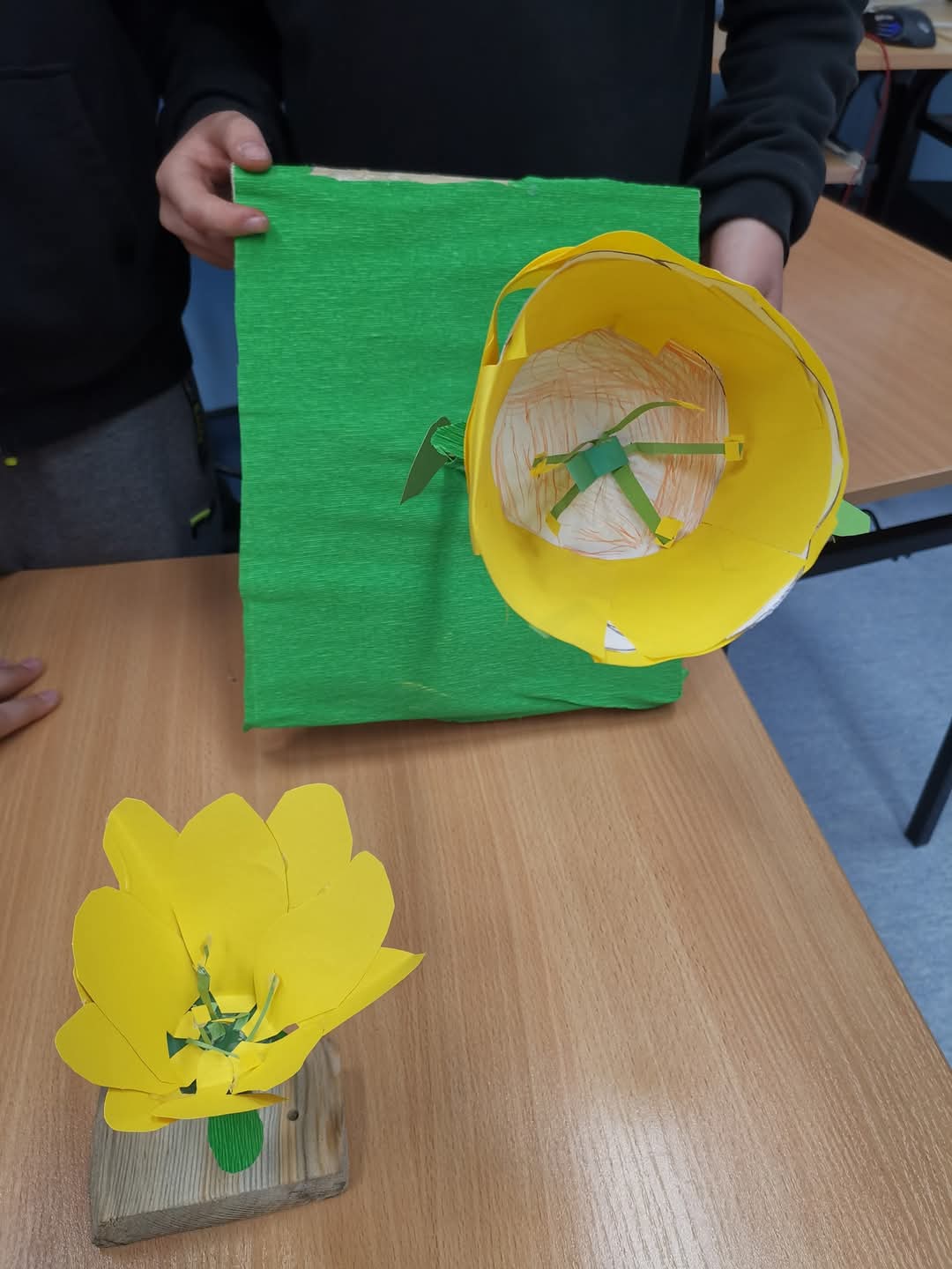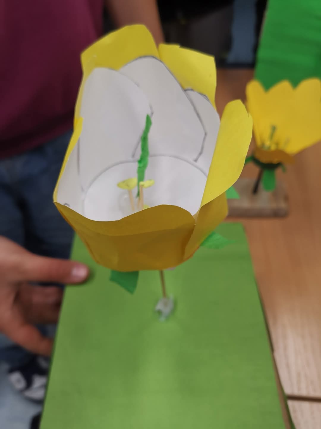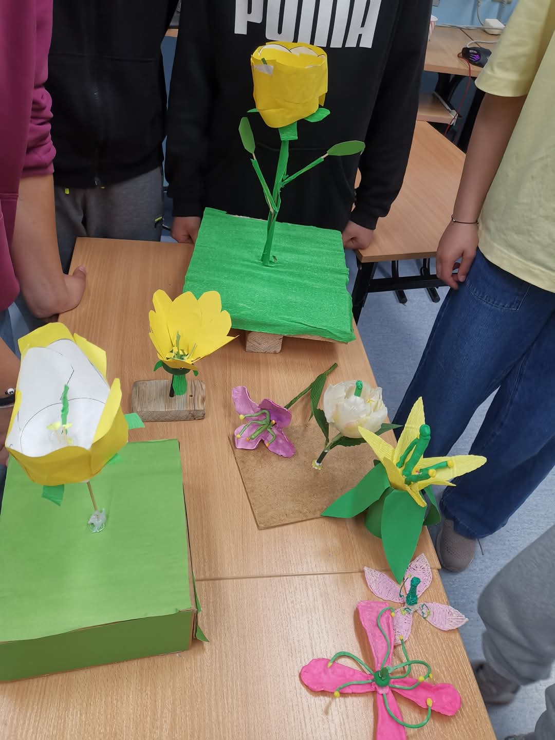 Podczas jednej z ostatnich lekcji biologii uczniowie klasy 5 poznawali rośliny okrytonasienne. Tematem zajęć była budowa kwiatu oraz funkcje jego poszczególnych elementów. Aby lepiej zrozumieć omawiany temat, uczniowie wykonali własnoręcznie modele kwiatów, które następnie prezentowali przed klasą, nazywając części budowy oraz wyjaśniając ich rolę.
