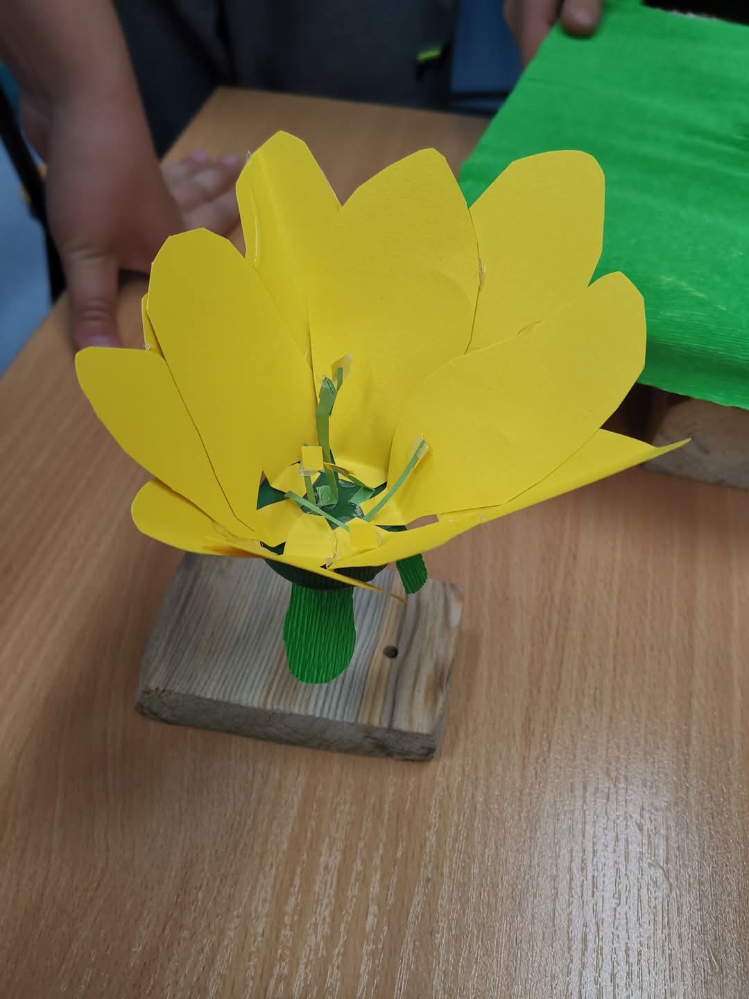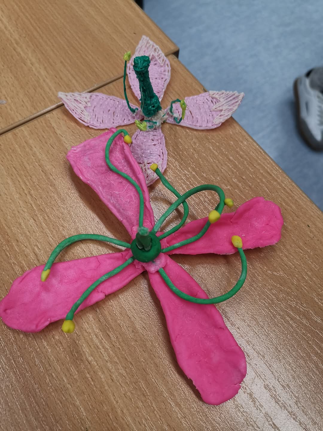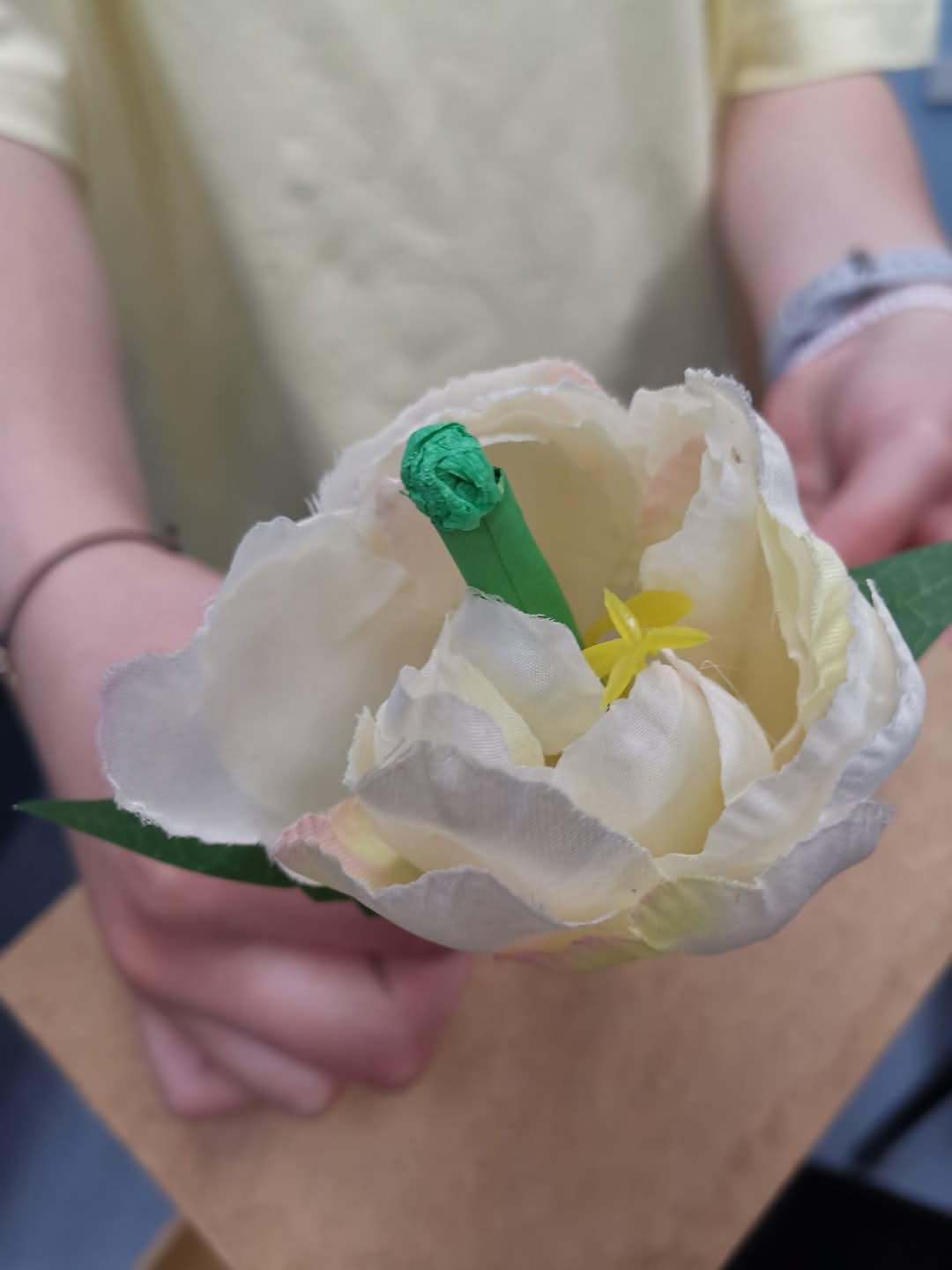 Podczas jednej z ostatnich lekcji biologii uczniowie klasy 5 poznawali rośliny okrytonasienne. Tematem zajęć była budowa kwiatu oraz funkcje jego poszczególnych elementów. Aby lepiej zrozumieć omawiany temat, uczniowie wykonali własnoręcznie modele kwiatów, które następnie prezentowali przed klasą, nazywając części budowy oraz wyjaśniając ich rolę.