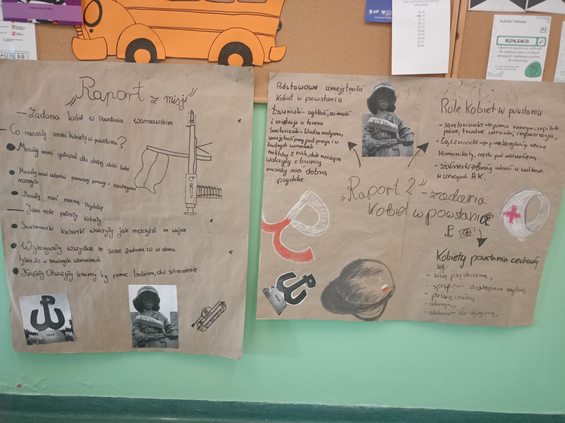 W ramach ogólnopolskiej akcji ,,BohaterON – włącz historię!" uczniowie naszej szkoły poznawali niezwykłe losy kobiet, które brały udział w Powstaniu Warszawskim. Dowiedzieliśmy się, że kobiety pełniły w czasie powstania bardzo ważne funkcje – były łączniczkami, sanitariuszkami, pielęgniarkami, kucharkami, peżetkami, kurierkami, a często także żołnierkami walczącymi na barykadach. Wykazywały się ogromną odwagą, poświęceniem i miłością do Ojczyzny.