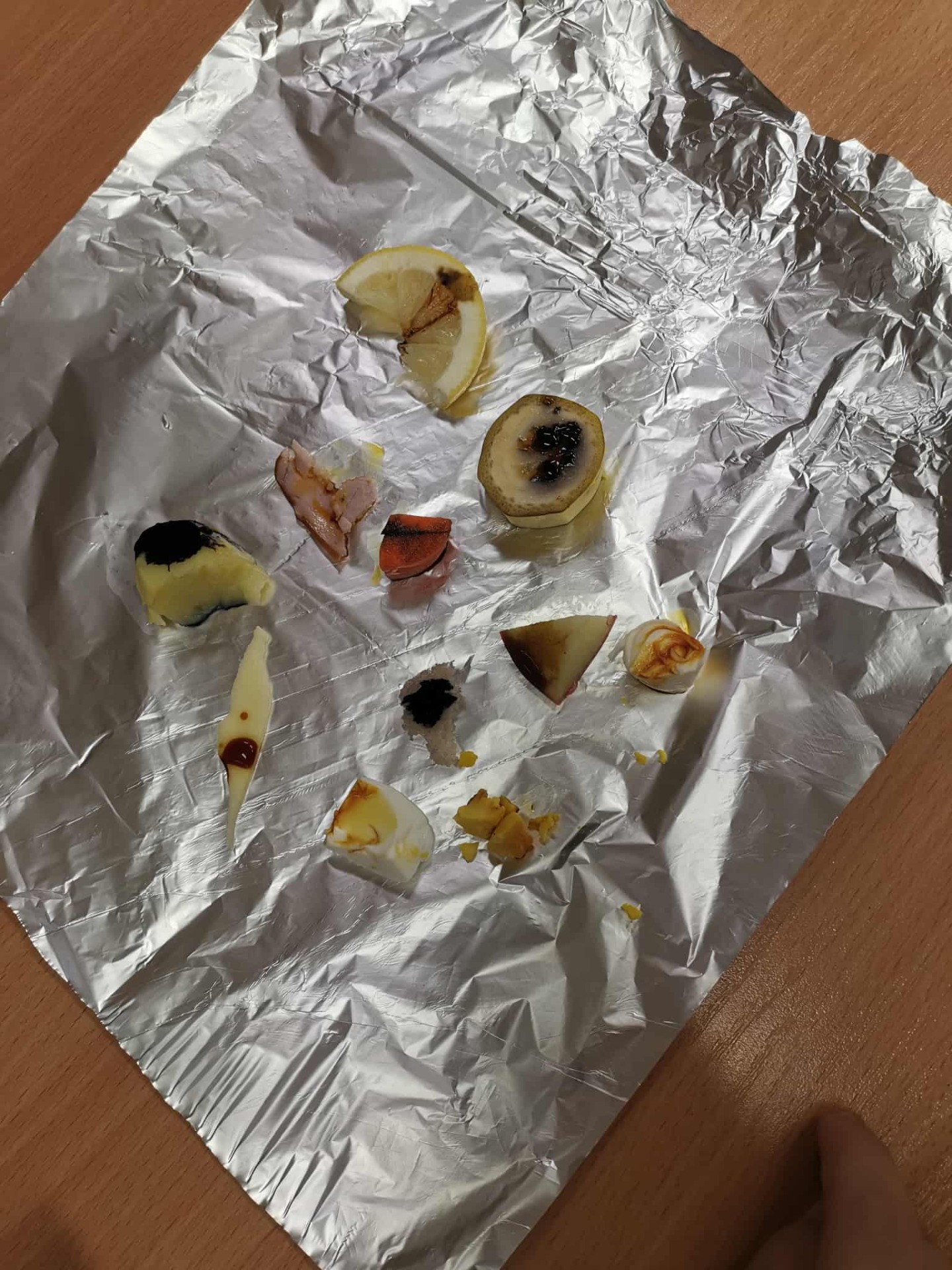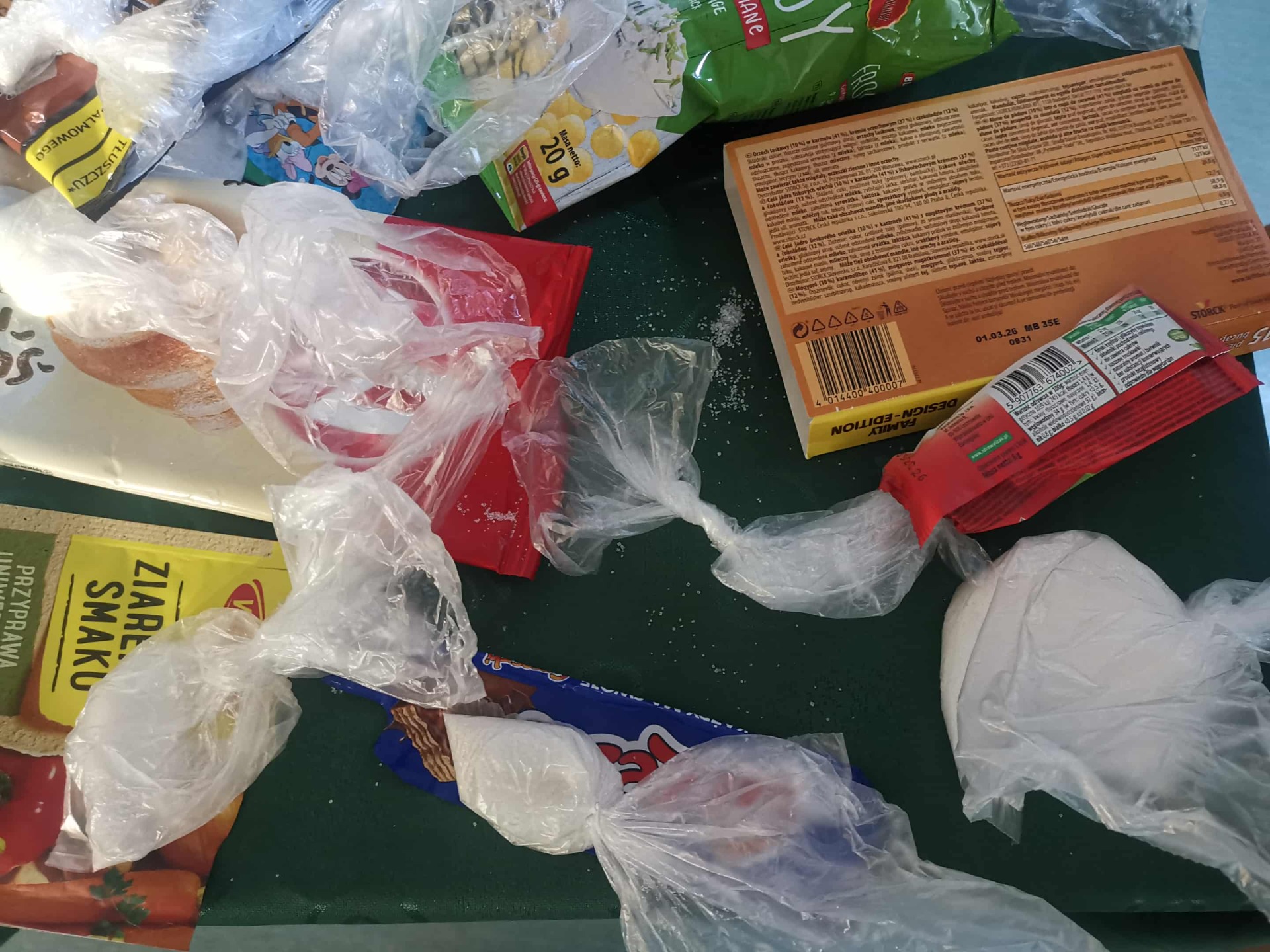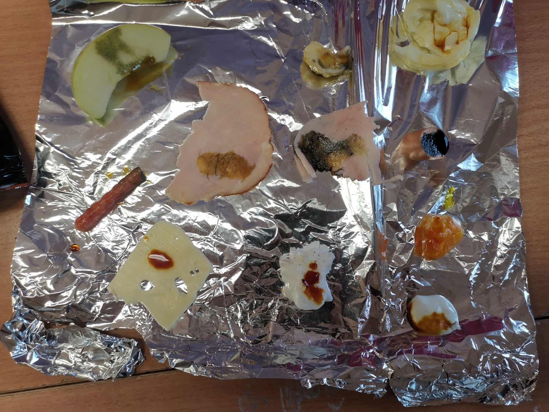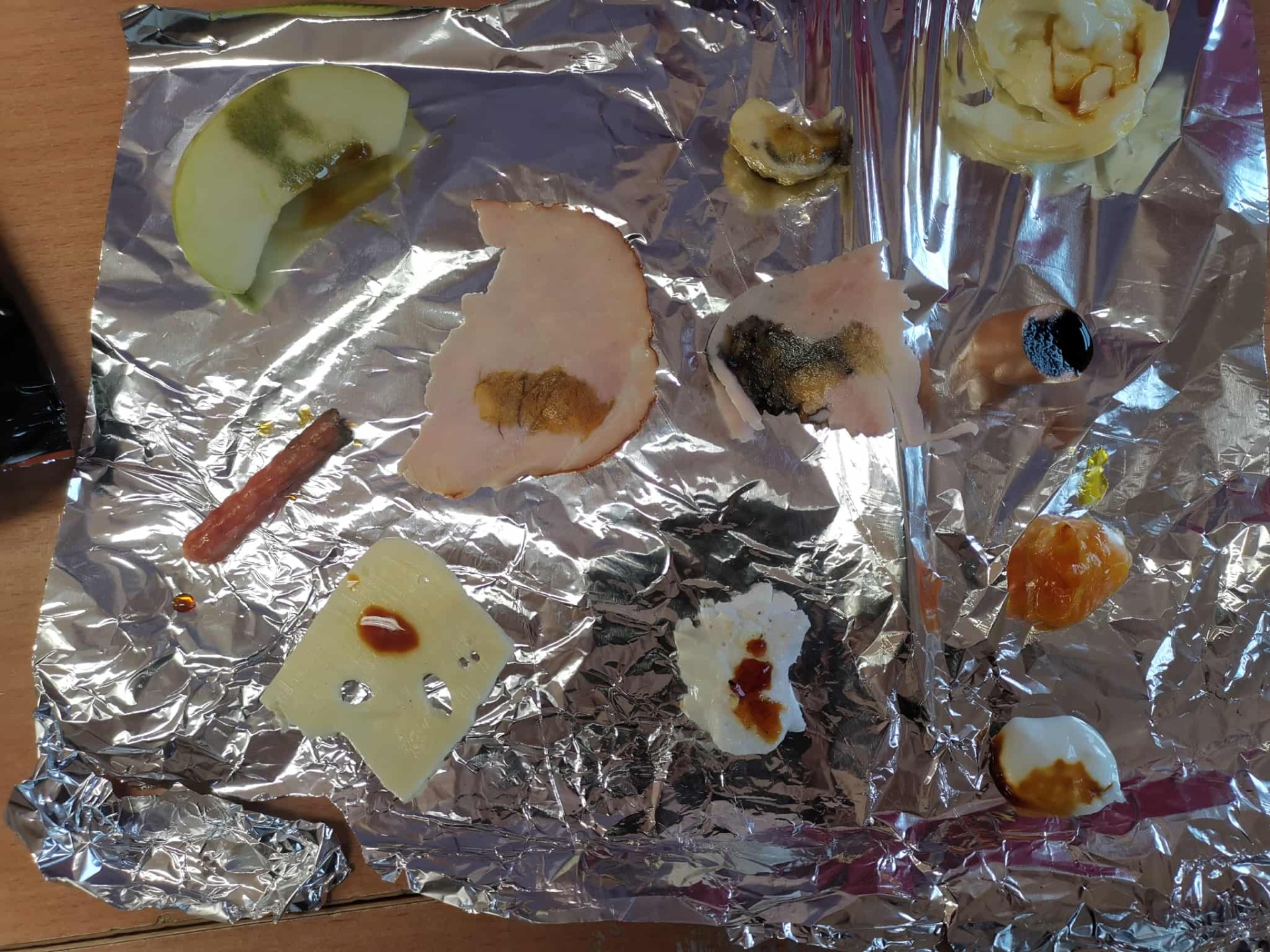 W drugiej części zajęć uczniowie, wykorzystując jodynę, badali obecność skrobi w produktach spożywczych. Skrobia to również węglowodan, czyli cukier złożony. Zaskoczeniem było odkrycie jej w produktach mięsnych, takich jak wędliny czy parówki!