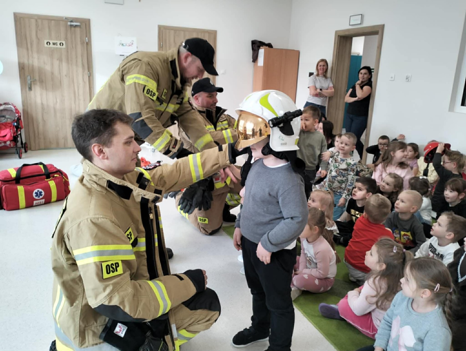 Nasze przedszkolaki gościły wyjątkowych gości – strażaków. Dzieci mogły z bliska zobaczyć, jak wygląda strażacki sprzęt, ubiór oraz przymierzyć hełm.