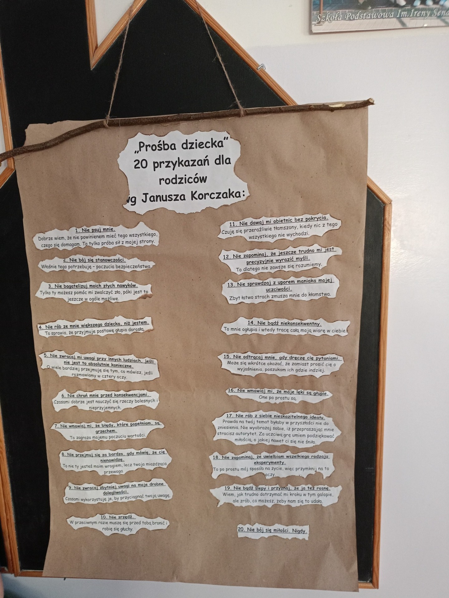 28. 11.2025r. w naszej szkole odbyły się obchody Międzynarodowego Dnia Praw Dziecka. Na początku cała społeczność szkolna obejrzała przygotowaną prezentację poświęconą Januszowi Korczakowi – wybitnemu pedagogowi, który znaczną część swojego życia poświęcił ochronie praw dziecka i ich propagowaniu. Po prezentacji uczniowie udali się do sal lekcyjnych, gdzie czekały na nich specjalnie przygotowane zadania związane z tematyką praw dziecka.